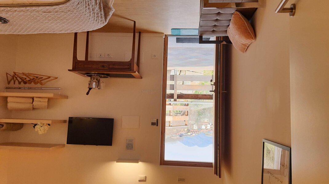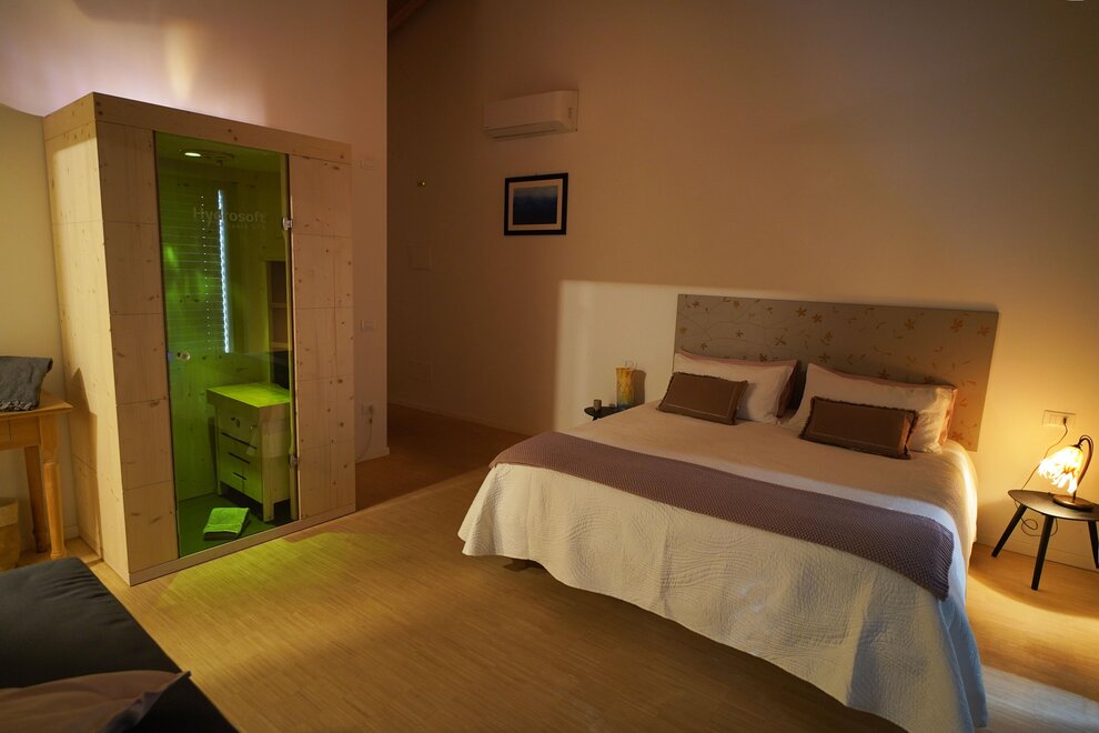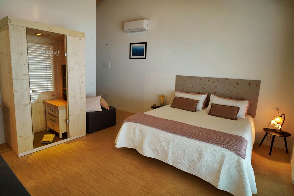 DOUBLE V této místnosti se nachází manželská postel. Pokoj má výhled na sever, do zahrady. Má prostornou terasu. Všechny naše pokoje mají podlahy, stropy a nábytek ze dřeva, klimatizaci a recirkulaci vzduchu, koupelnu s WC, bidetem a sprchou. Všechny pokoje mají společnou zahradu. V pokojích se nachází TV a fén.