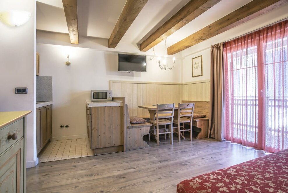 Bilo Prestige: obývací pokoj s manželskou postelí s výsuvným mechanismem, kuchyňský kout a jídelní prostor, koupelna s vířivkou, balkon. Umístěno na přední straně domu, nabízí výhled na centrum obce. ZAHNUTO: postele připravené při příjezdu, dvojité vybavení ložního prádla, energie, konečný úklid (kromě kuchyňského koutu a likvidace odpadu), TV, přístup ke službám objektu.