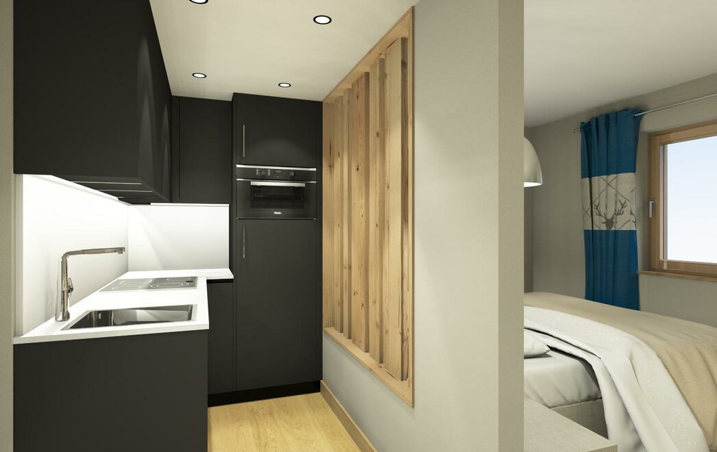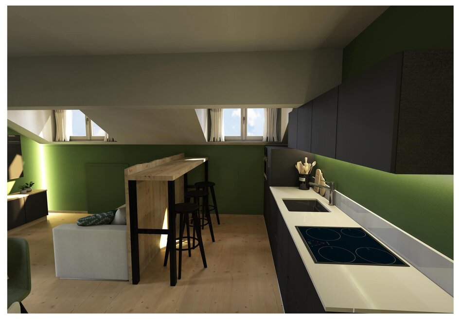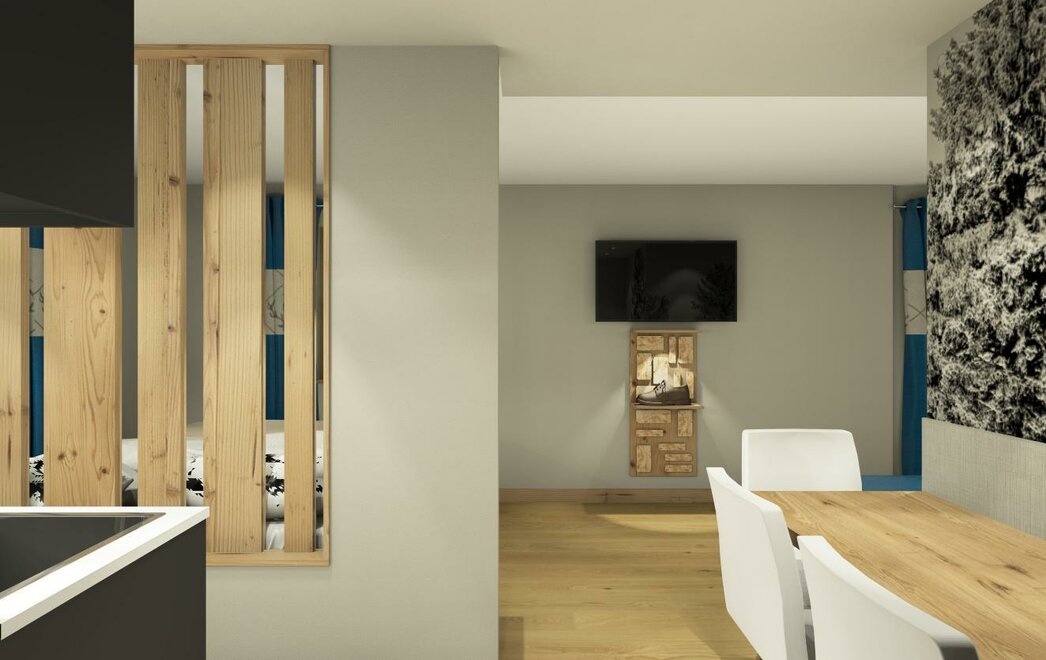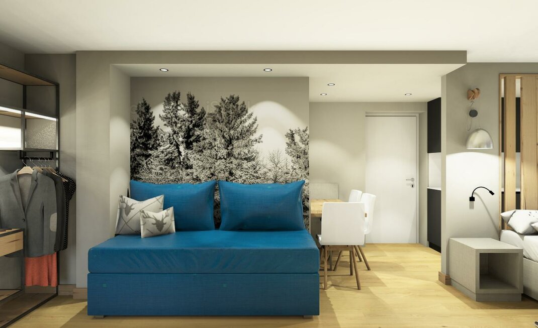 apartmán se 1 manželskou ložnicí, 1 koupelnou, kuchyní a obývacím pokojem s balkonem a rozkládací pohovkou