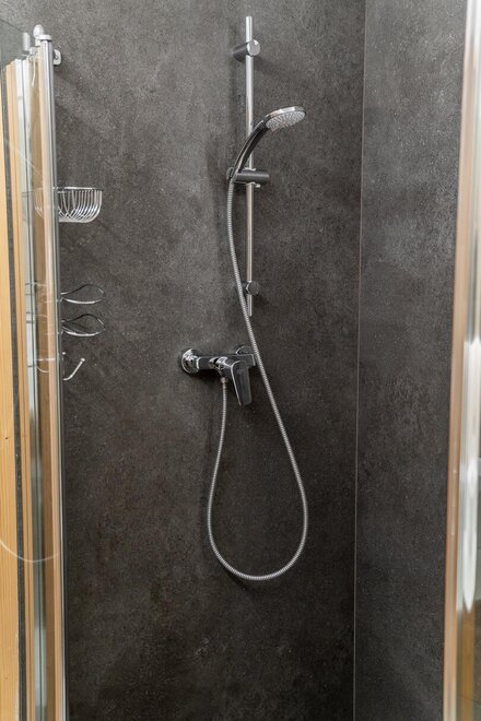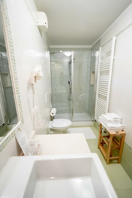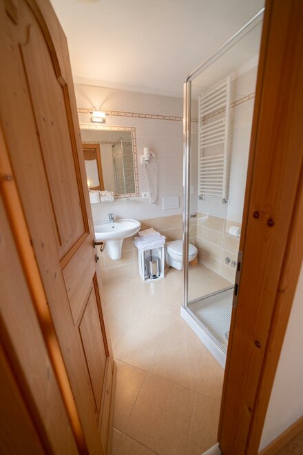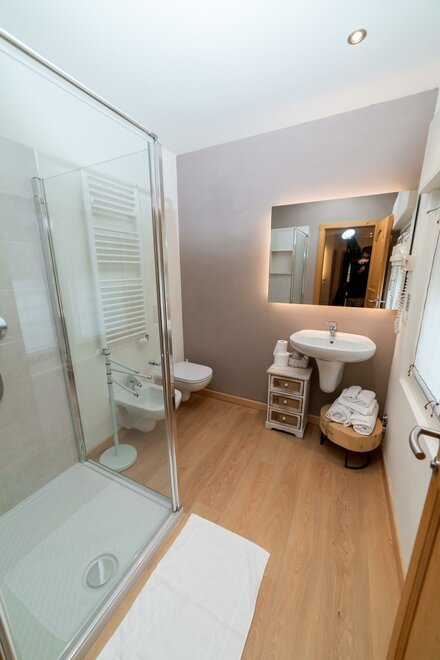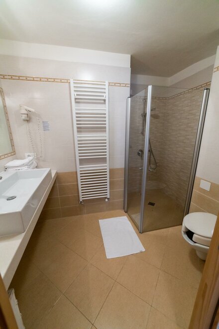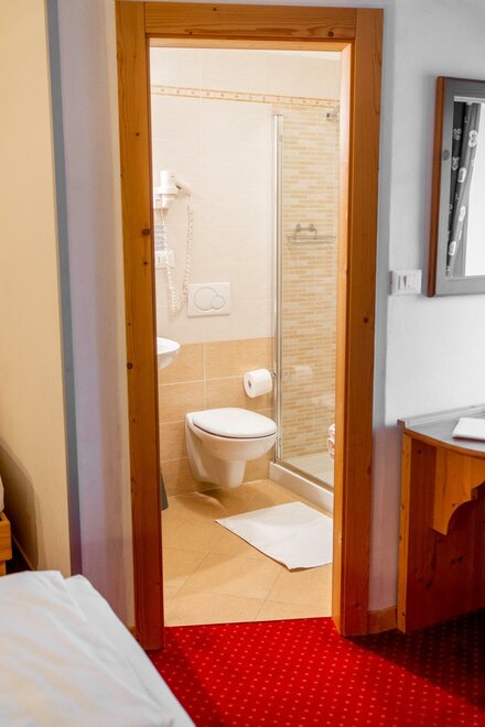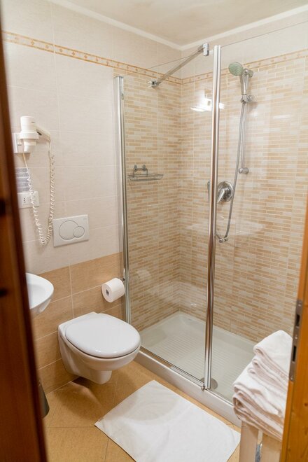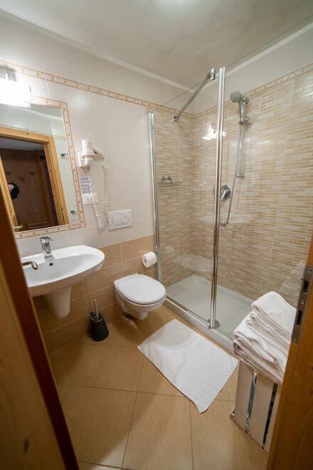 Pokoj v horském stylu s možností mít manželskou postel + jednolůžko nebo tři jednolůžkové postele. Vybaven soukromou koupelnou se sprchou a fénem.