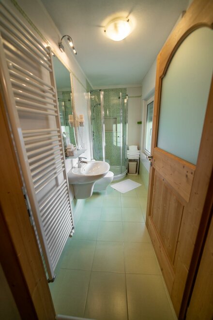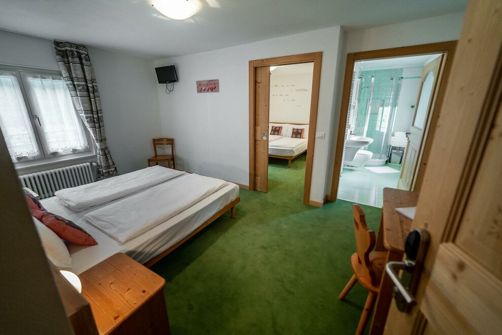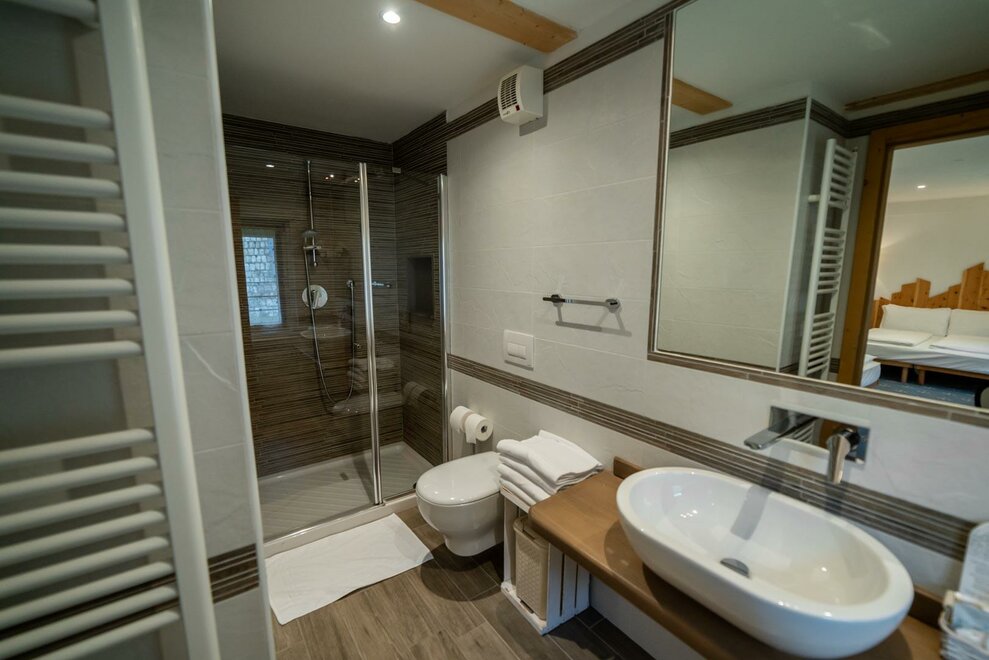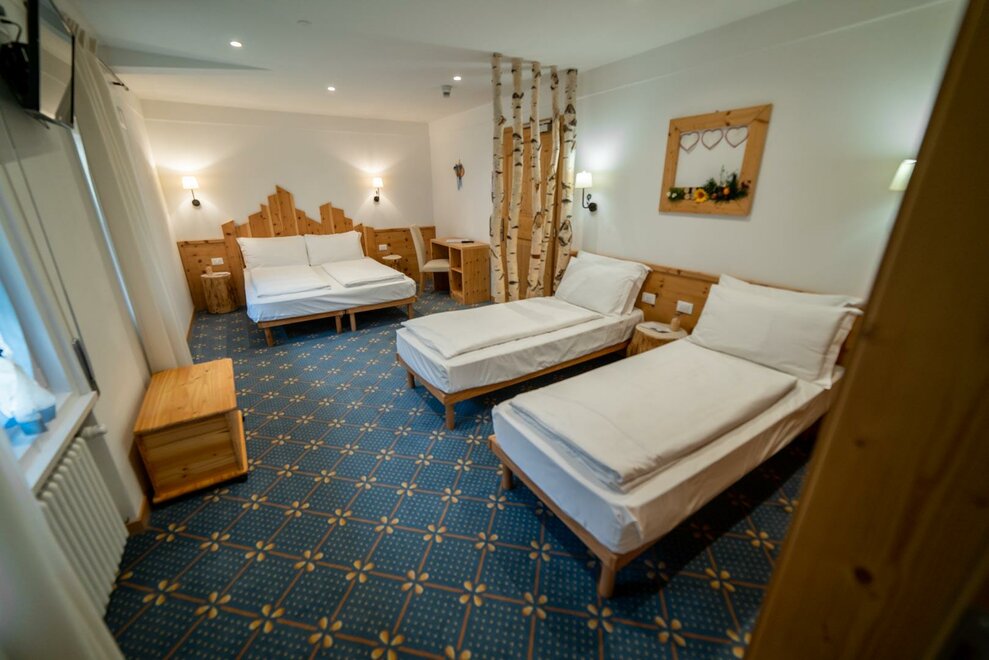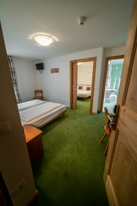 Pokoj v horském stylu s možností mít manželskou postel + jednolůžko nebo čtyři jednolůžka. Je vybaven soukromou koupelnou se sprchou a fénem.