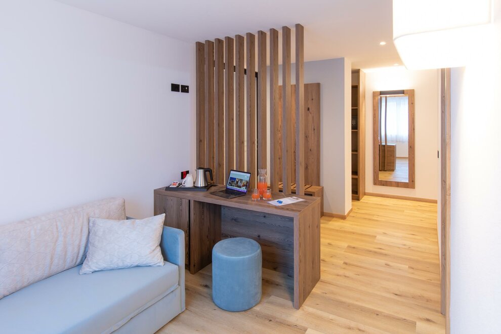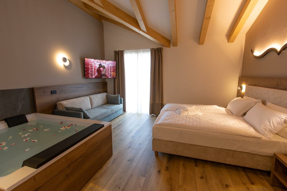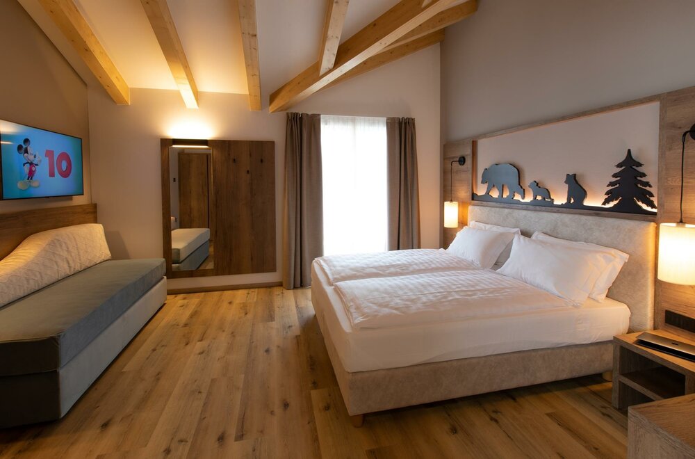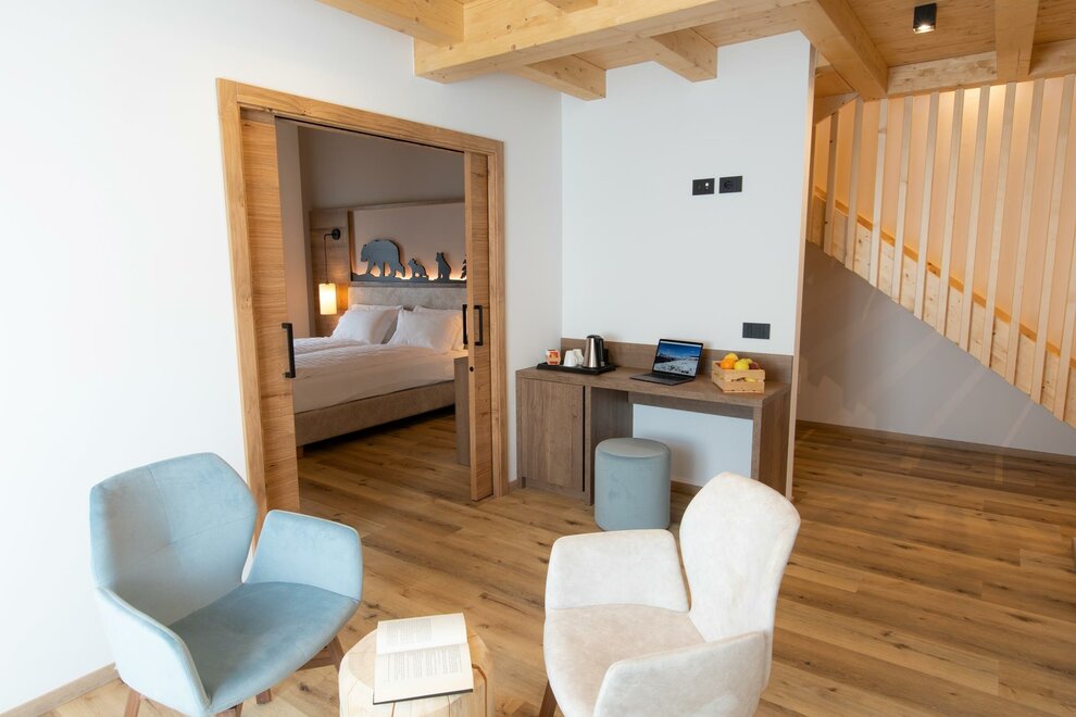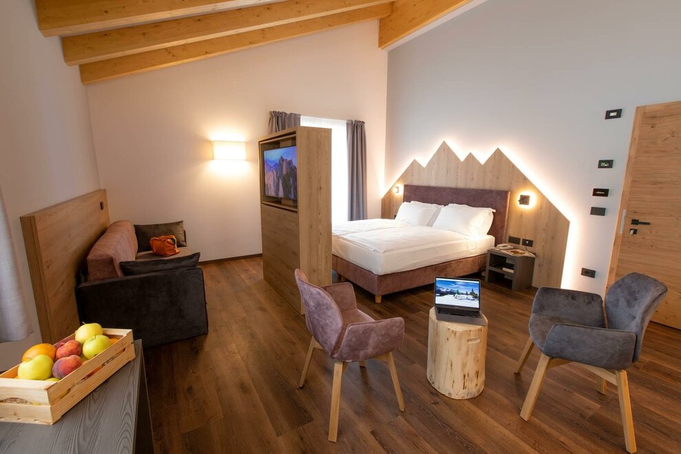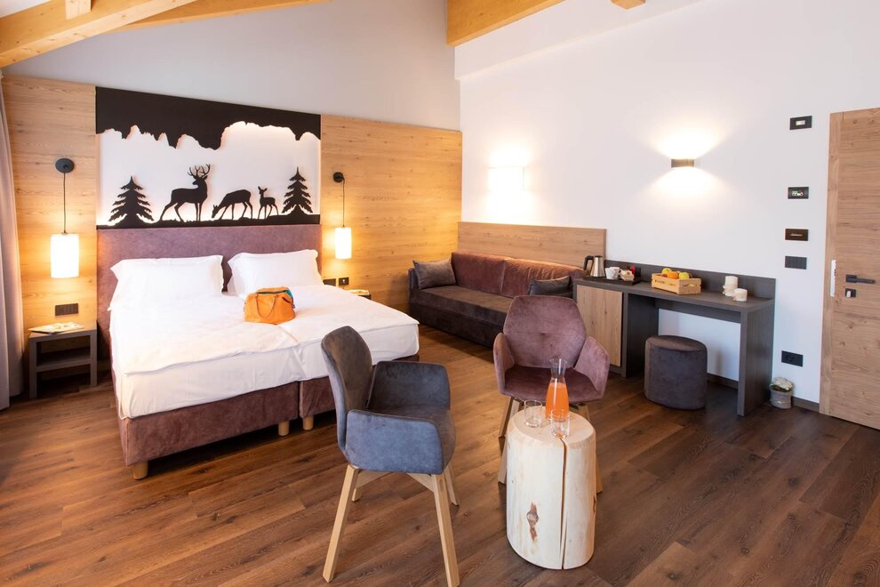 Čaro Brentských Dolomit se odráží v interiérech s jemnými liniemi, vyrobených z přírodních materiálů, a v samotném názvu pokoje. Světlé odstíny od béžové po modrou dodávají jasnost a teplo, což z tohoto pokoje činí malé hnízdo lásky pro rodiny.