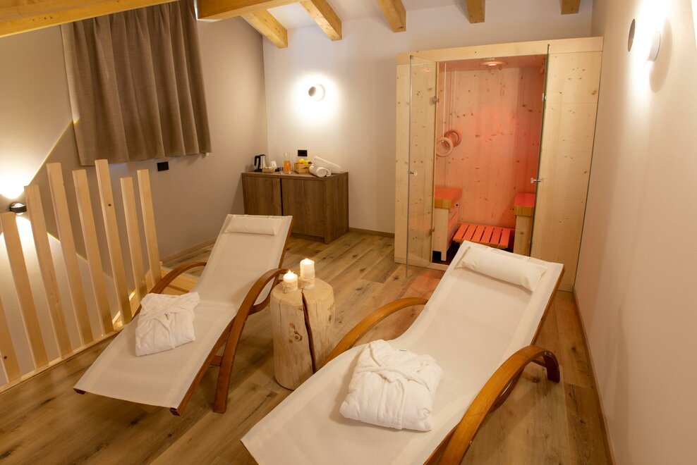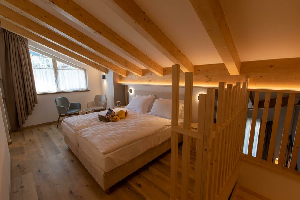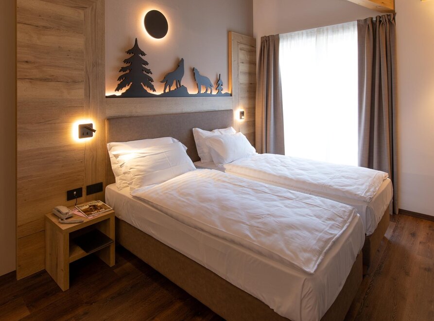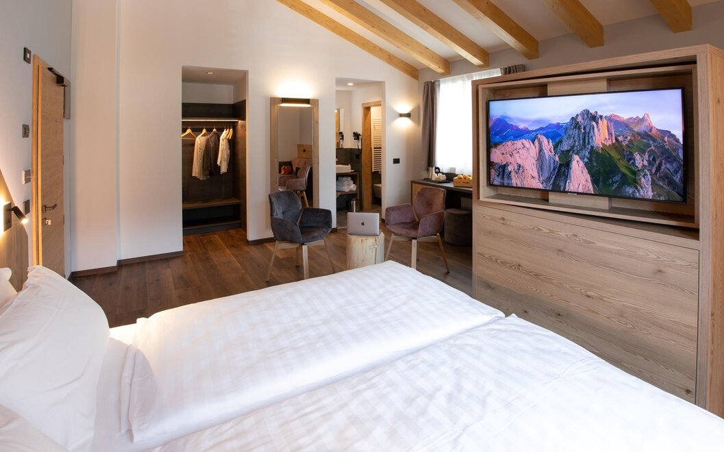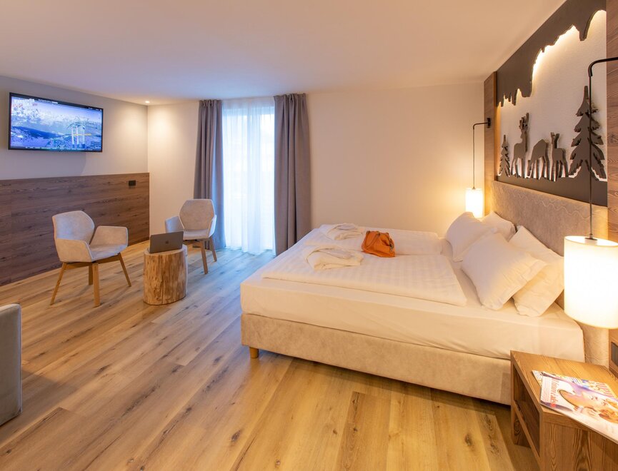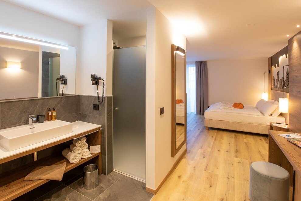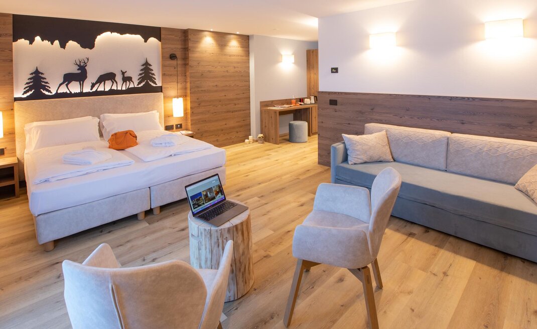 Čaro Brentských Dolomit se odráží v interiérech s jemnými liniemi, vyrobených z přírodních materiálů, a v samotném názvu pokoje. Světlé odstíny od béžové po modrou dodávají jasnost a teplo, což z tohoto pokoje činí malé hnízdo lásky pro rodiny.