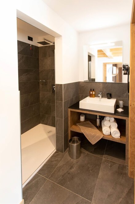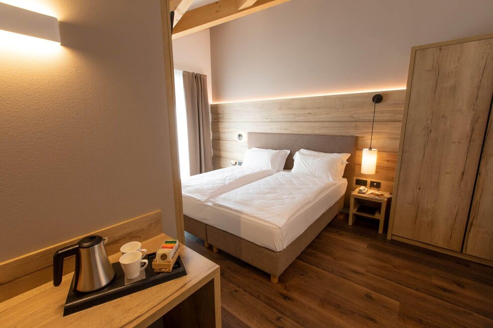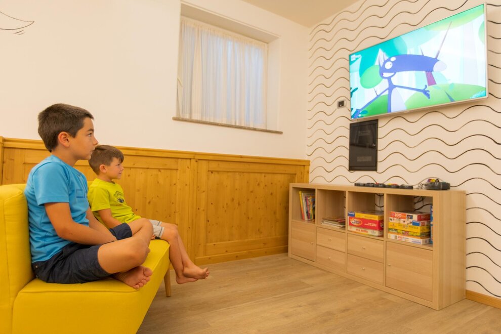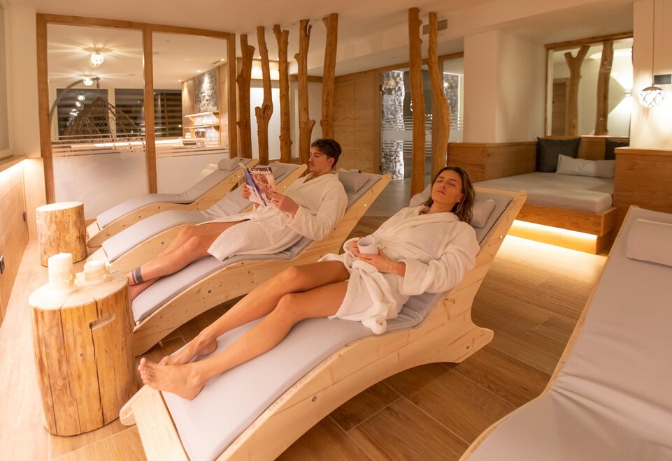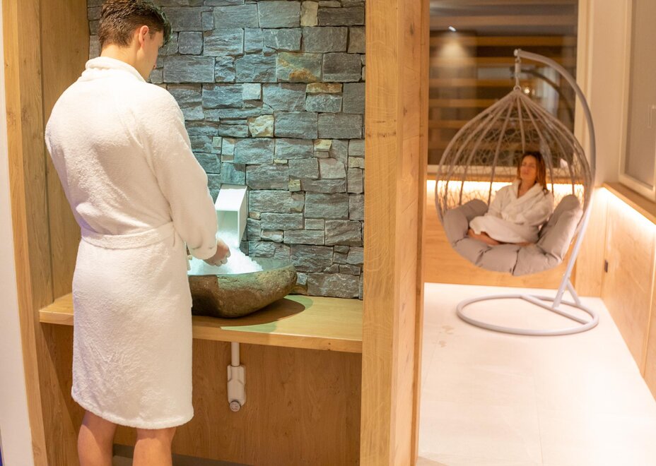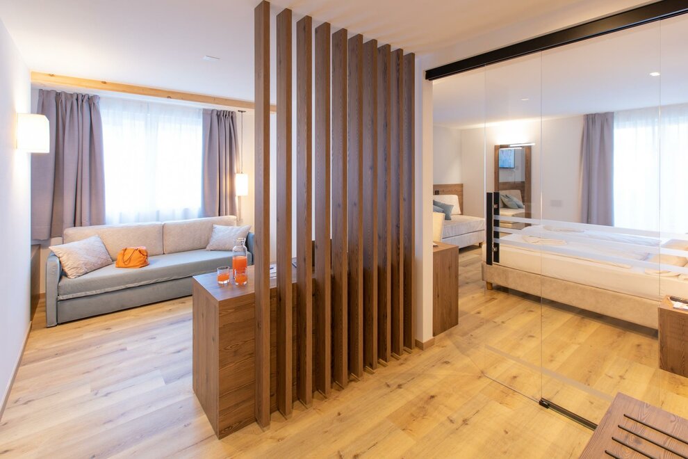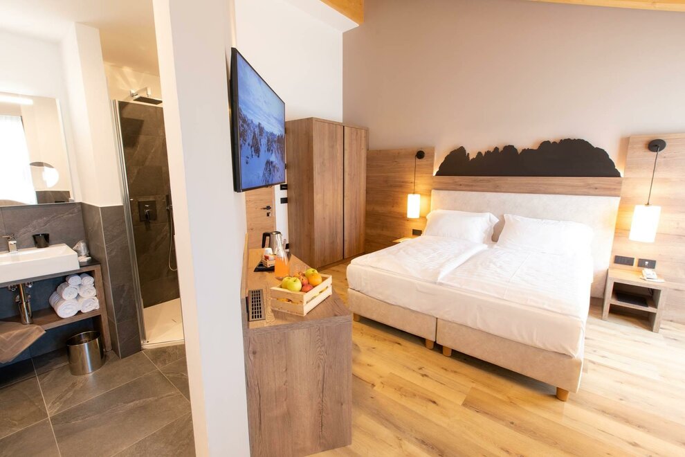 Čaro Brentských Dolomit se odráží v interiérech s jemnými liniemi, vyrobených z přírodních materiálů, a v samotném názvu pokoje. Světlé odstíny od béžové po modrou dodávají jasnost a teplo, což z tohoto pokoje činí malé hnízdo lásky pro rodiny.