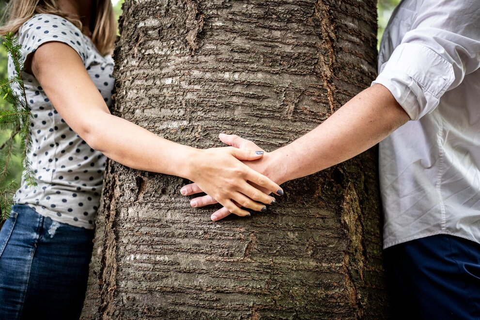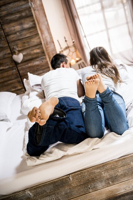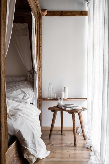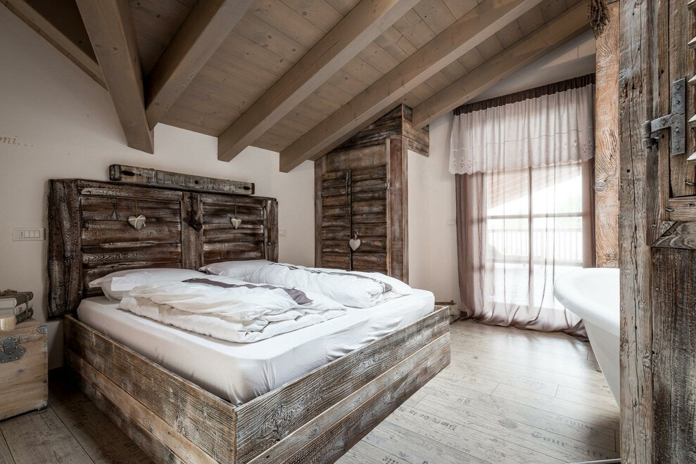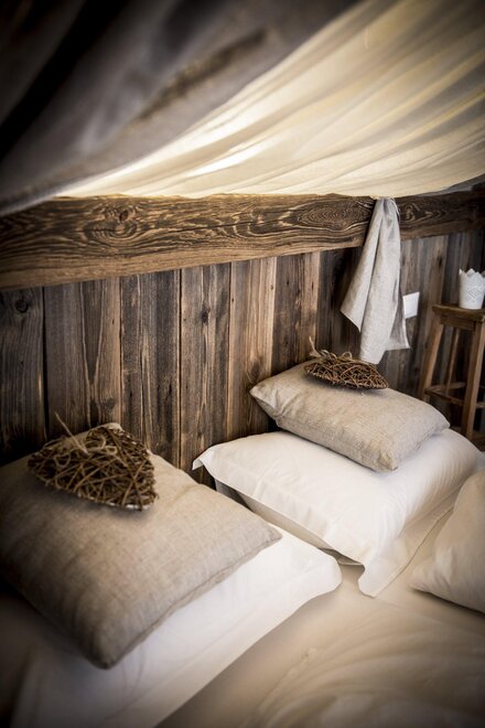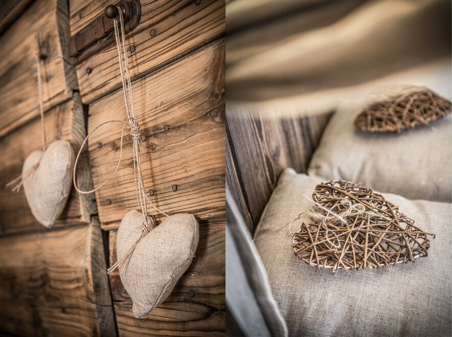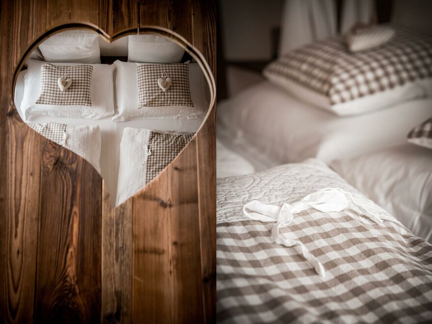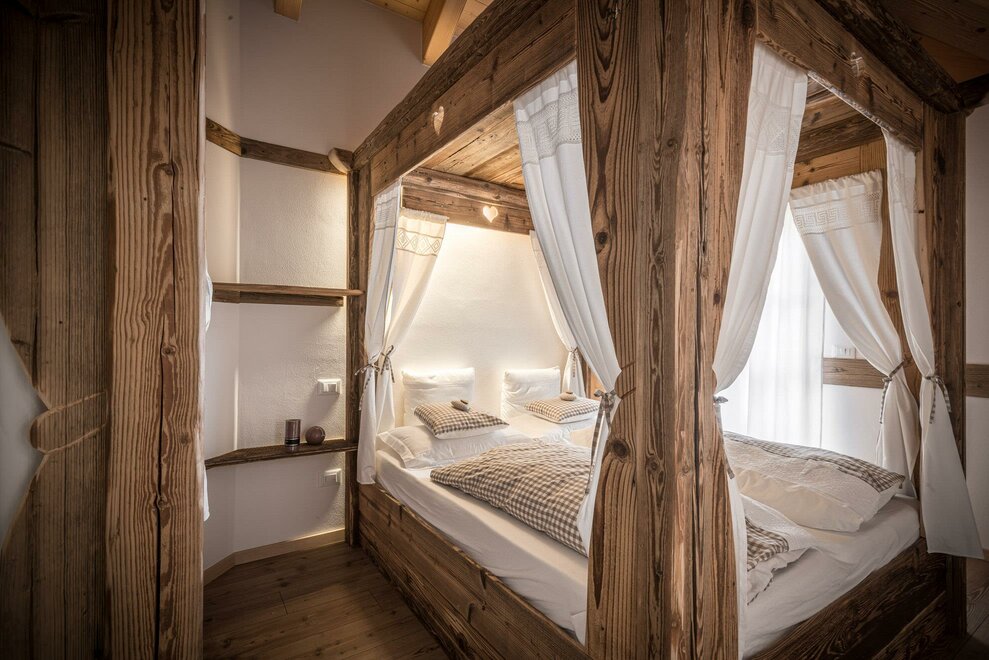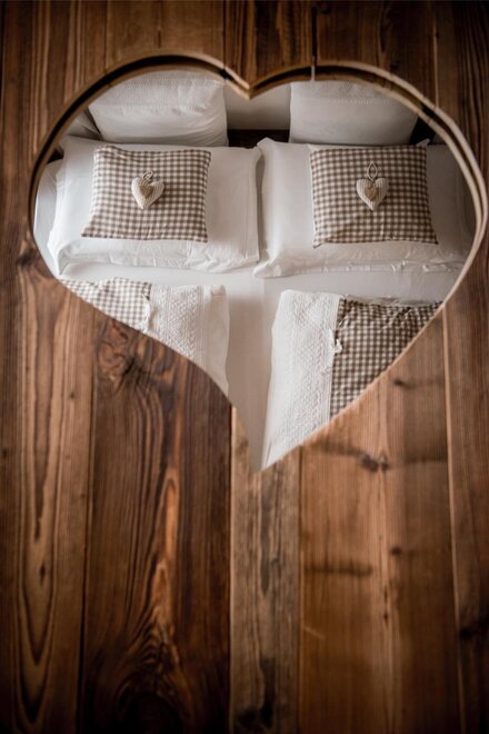 Postel s baldachýnem ve tvaru srdce, teplo dřeva a veškeré pohodlí pro dva.