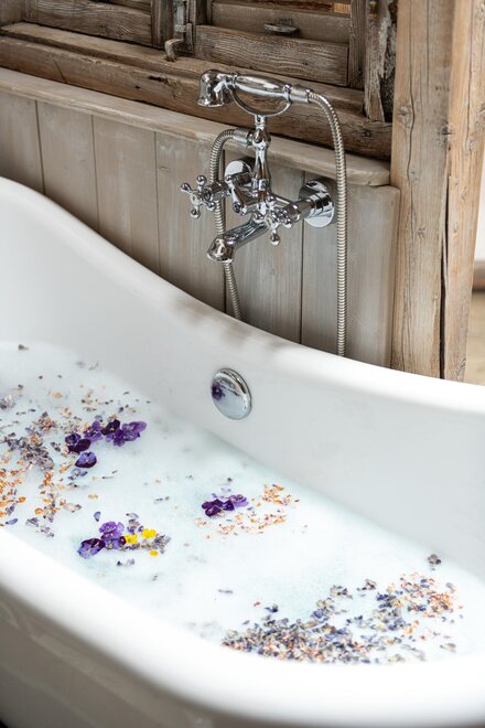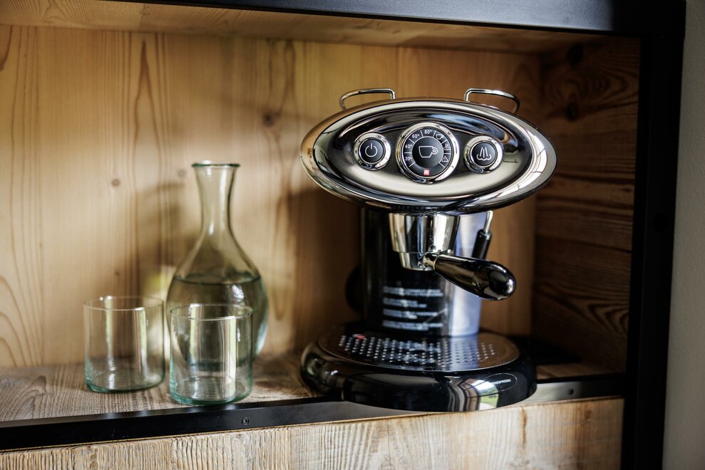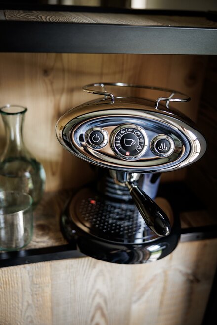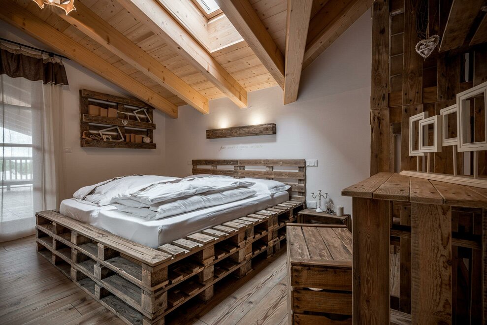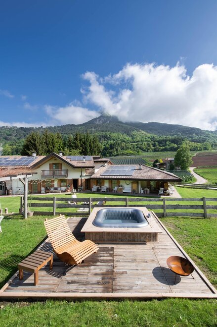 Jednoduchý dřevěný apartmán v přízemí s vanou na výhled, který poskytuje sladké okamžiky odpočinku. Jižní balkón pro vychutnání panoramatu na zahradu a hory, terasa o rozloze 30 m² na východ pro obdivování západů slunce na hoře Bondone a pro příjemné večeře v intimním prostředí.
