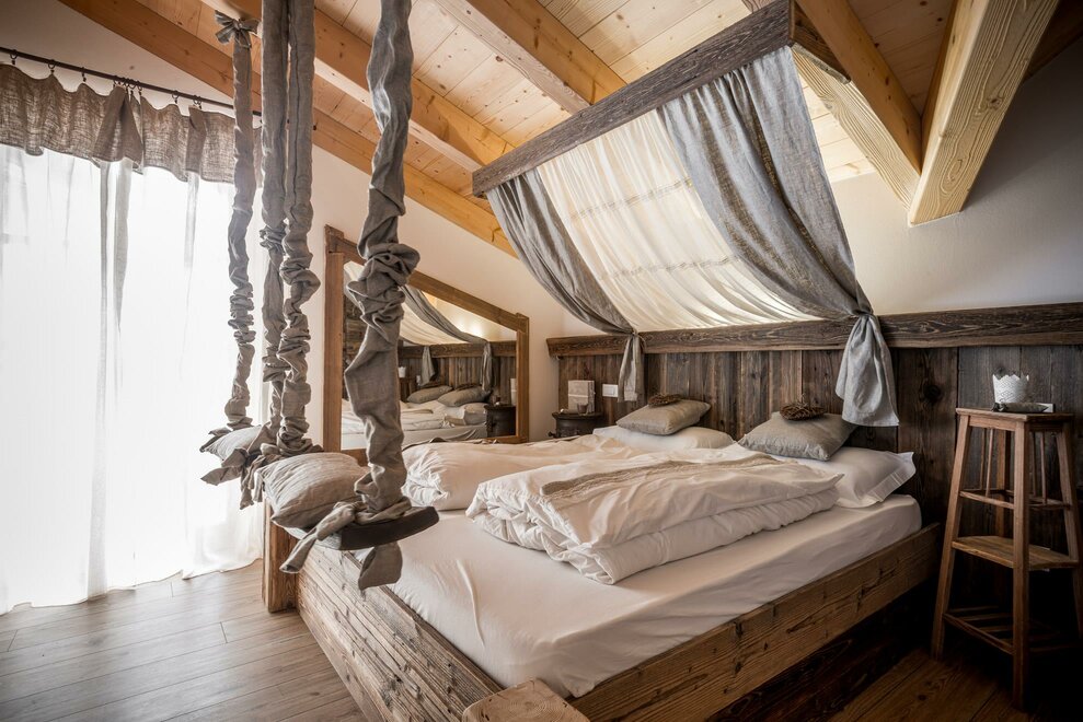 Šest pokojů, které čekají na objevování, každý zařízený zvláštním stylem, pro pobyt plný emocí: malé a útulné horské hnízdo, kde zažijete vzrušení a pocit svobody z houpačky, intimitu postele s nebesy, relaxaci a sladké pocity z voňavé koupele
