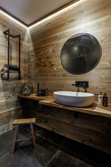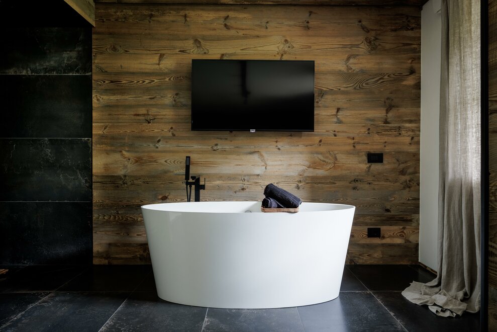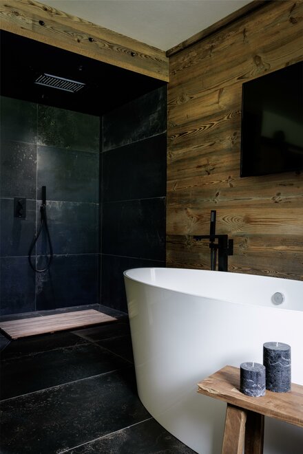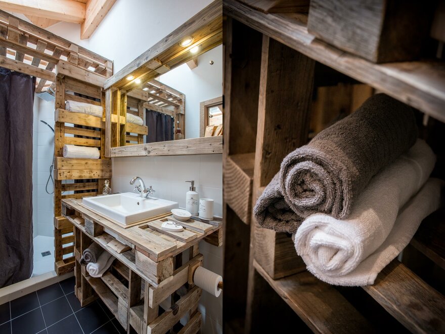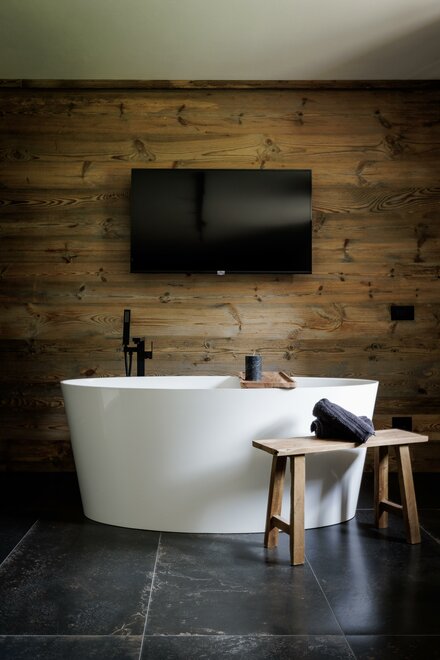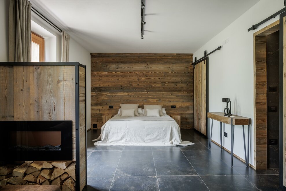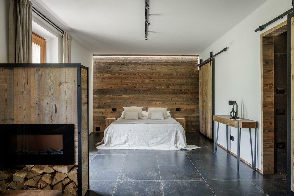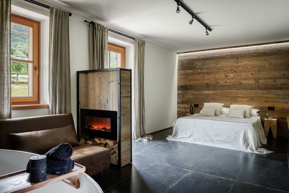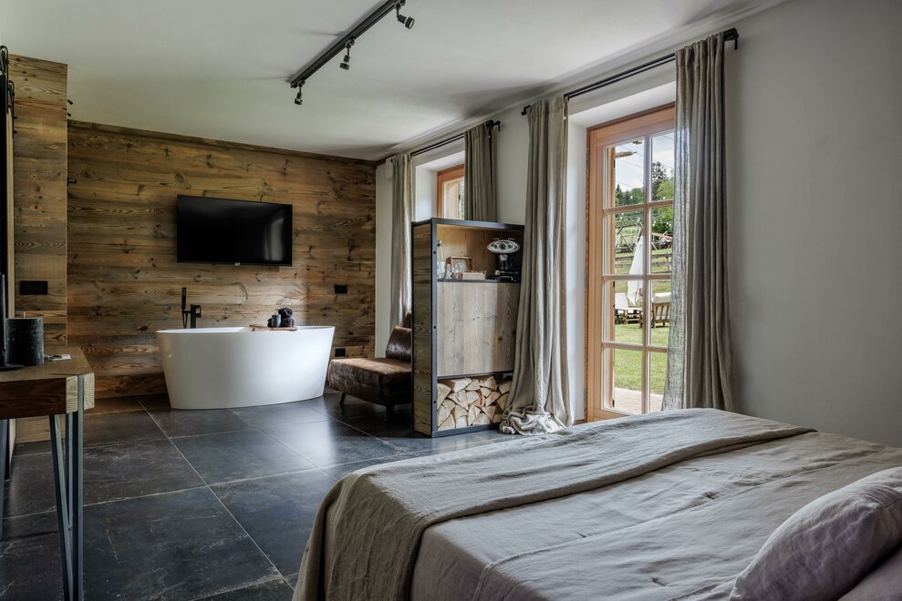 Suite, kde se teplo dřeva setkává s modernou, v přízemí, s vlastním vchodem směřujícím do zahrady. Útěk pro 2 osoby zařízený moderním stylem, kde se dřevo a industriální styl setkávají, sprchový kout z porcelánového gresu a vanou na očích, abyste si mohli užít krb v naprostém klidu;