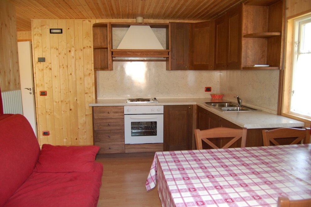 Dřevěná chata o rozloze 40 m², rozdělená na dvě ložnice, kuchyňsko-obývací prostor, koupelnu s oknem a sprchou, balkon. Zařízená dřevem. Každá chata může ubytovat až šest osob. Bezplatné parkování je k dispozici v těsné blízkosti. Dvě z našich bungalovů jsou zvlášť vhodné pro osoby se zdravotním postižením, jelikož jsou vybaveny širokými vchodovými dveřmi, které jsou přístupné pomocí speciální rampy, přizpůsobenými toaletami a vnitřními dveřmi o šířce 80 cm.