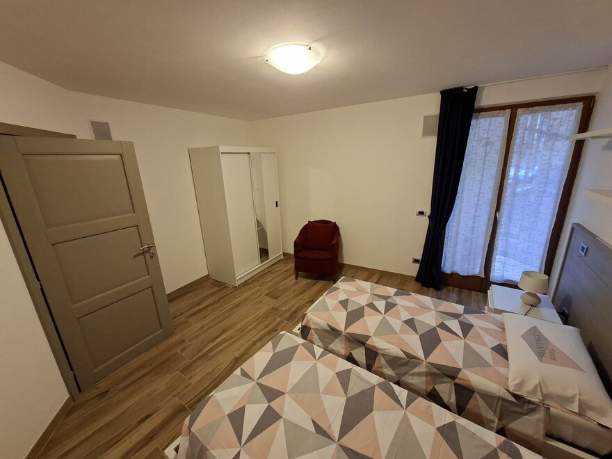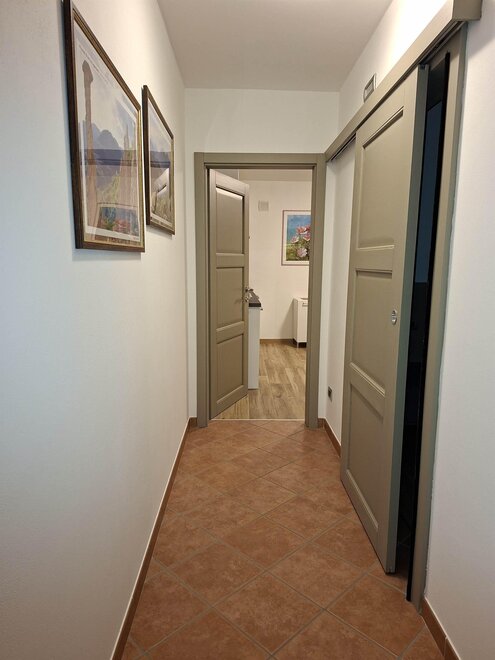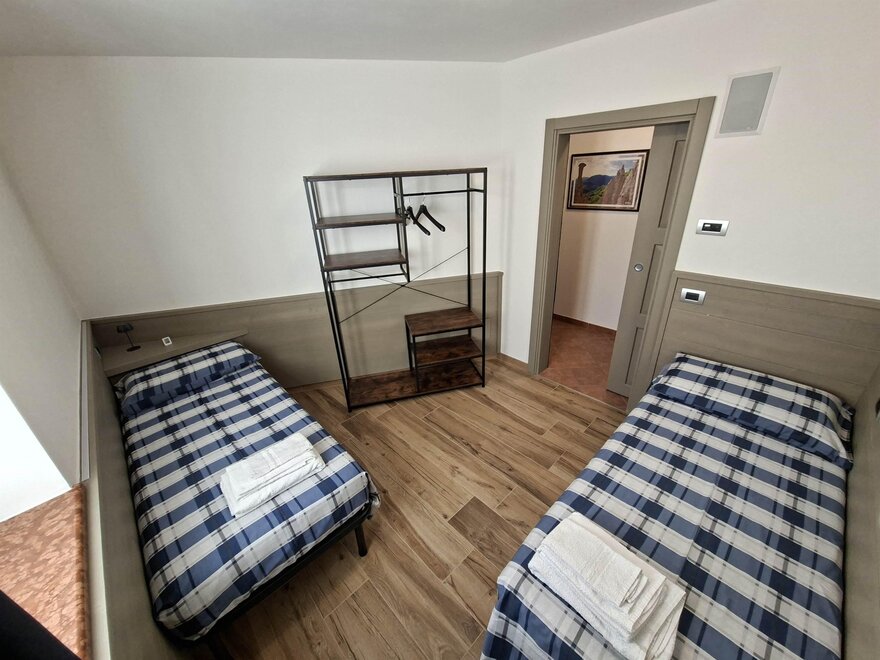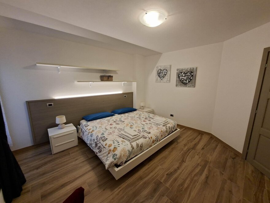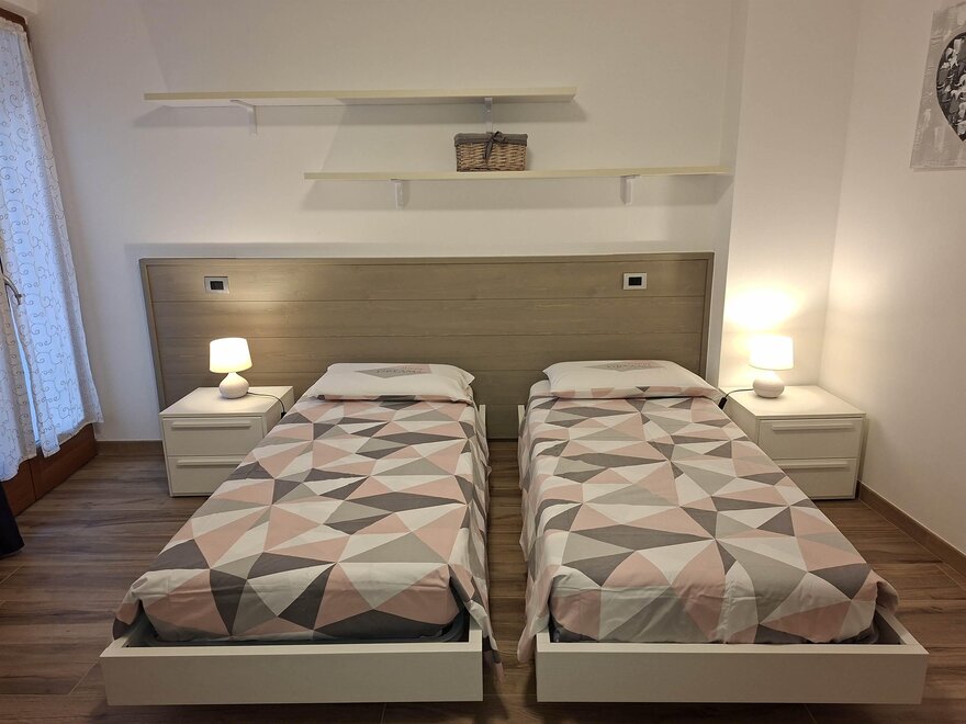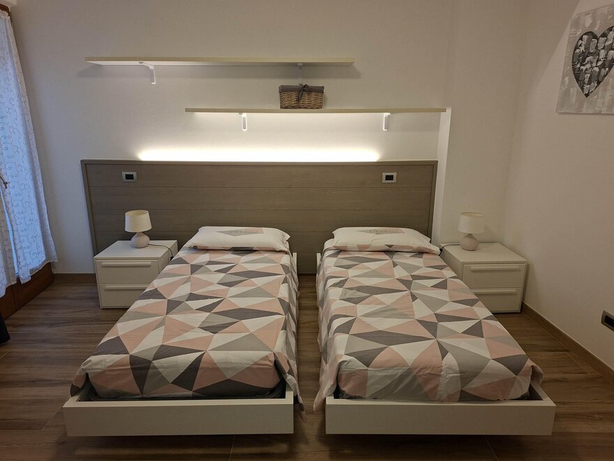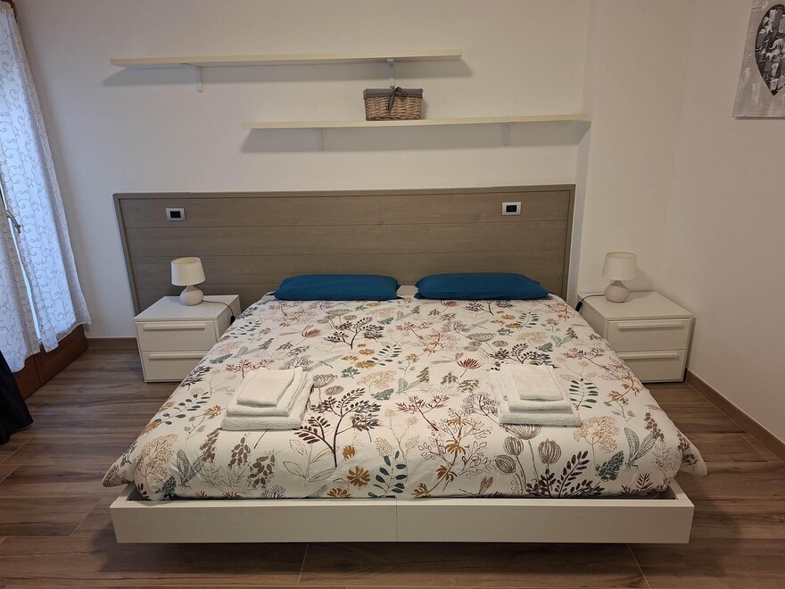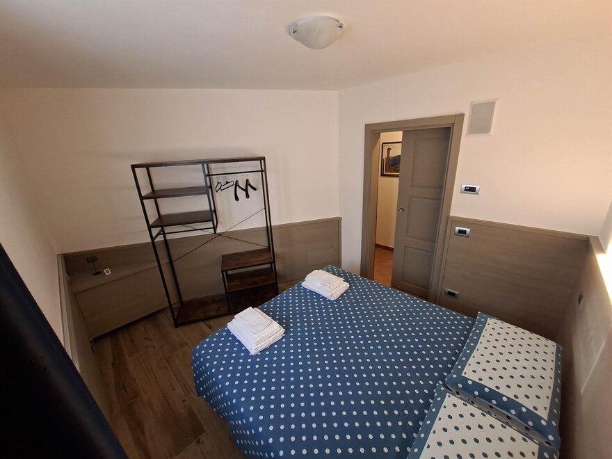 Ubytování se nachází v prvním patře, je vhodné pro 4 osoby, vybavené všemi pohodlími a skládá se ze dvou ložnic, jedné manželské ložnice s malým balkonem a jedné dvojité ložnice, která může na vyžádání přejít na dvě dvojité nebo dvě manželské. Koupelna s multi-funkční sprchou, fén, sprchový gel atd. Kuchyň je zařízena troubou, lednicí s mrazničkou, mikrovlnnou troubou, myčkou, plynovým sporákem, nádobím, příbory a kuchyňským textilem. Wi-fi zdarma, vyhrazené parkování na pozemku před domem, možnost uložit e-bike v garáži a provést nabíjení baterií. Najdete zde pračku, vysavač, žehličku a žehlicí prkno. V obývacím prostoru, kuchyňský kout, pohovka a smart-tv. Každý pokoj je vybaven individuálním topením, rádio tunerem. Ručníky a ložní prádlo jsou v ceně. Najdete zde také několik potravin na snídani a pro nejmenší je k dispozici vysoká židle a postýlka. Možnost přidání dalšího jednolůžka.