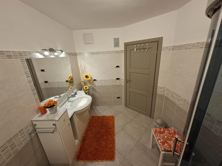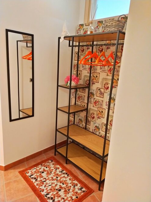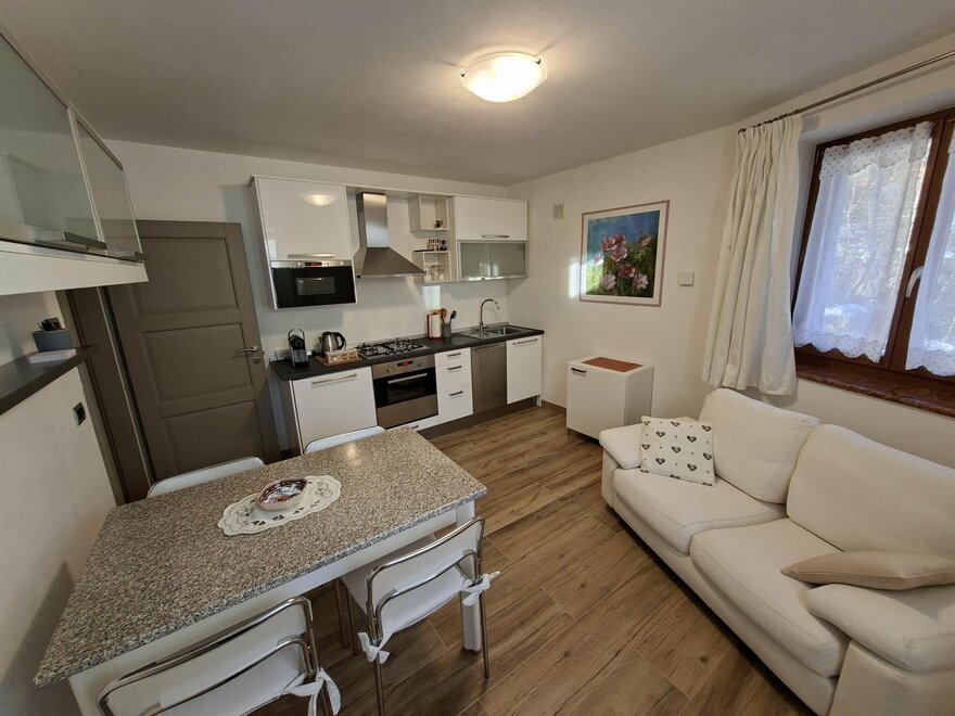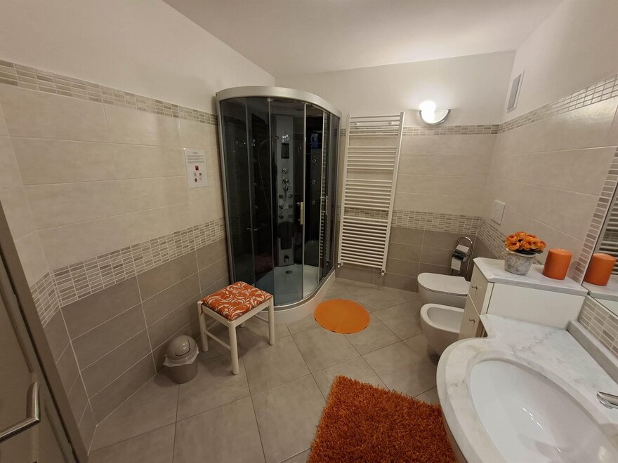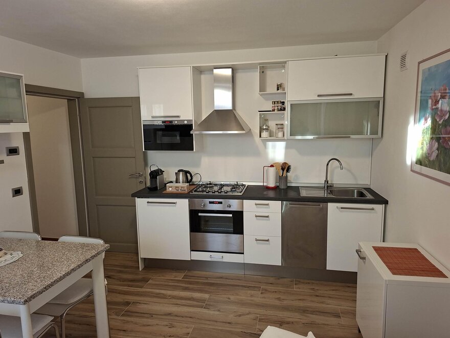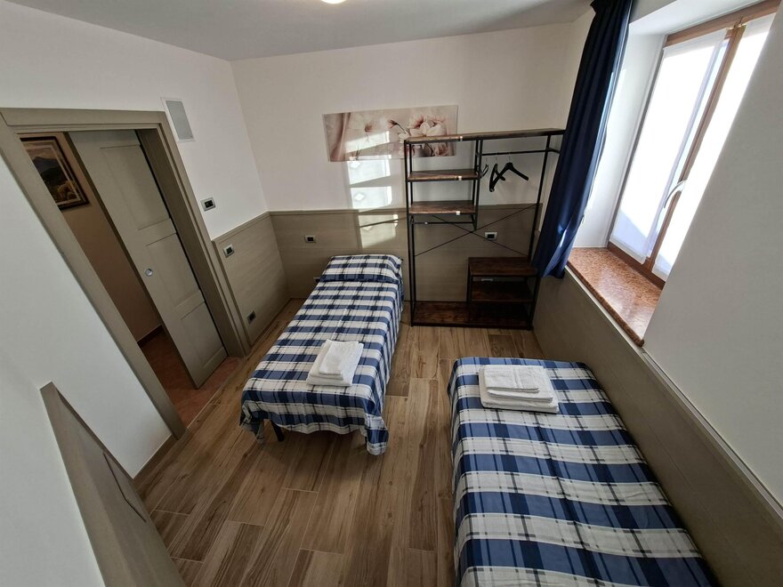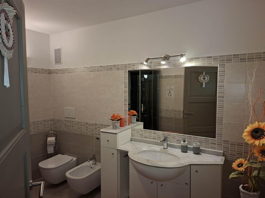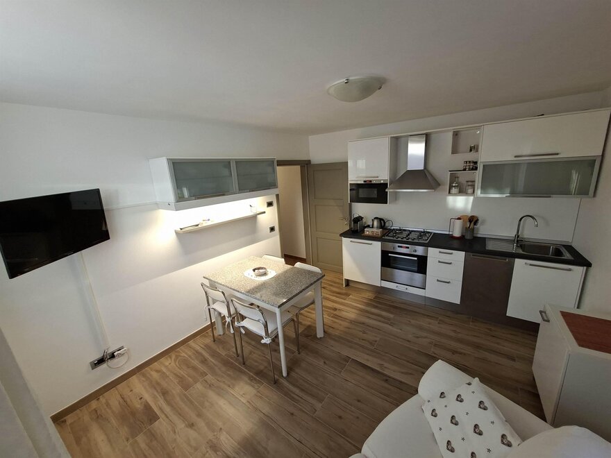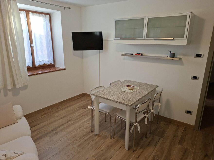 Ubytování se nachází v prvním patře, je vhodné pro 4 osoby, vybavené všemi pohodlími a skládá se ze dvou ložnic, jedné manželské ložnice s malým balkonem a jedné dvojité ložnice, která může na vyžádání přejít na dvě dvojité nebo dvě manželské. Koupelna s multi-funkční sprchou, fén, sprchový gel atd. Kuchyň je zařízena troubou, lednicí s mrazničkou, mikrovlnnou troubou, myčkou, plynovým sporákem, nádobím, příbory a kuchyňským textilem. Wi-fi zdarma, vyhrazené parkování na pozemku před domem, možnost uložit e-bike v garáži a provést nabíjení baterií. Najdete zde pračku, vysavač, žehličku a žehlicí prkno. V obývacím prostoru, kuchyňský kout, pohovka a smart-tv. Každý pokoj je vybaven individuálním topením, rádio tunerem. Ručníky a ložní prádlo jsou v ceně. Najdete zde také několik potravin na snídani a pro nejmenší je k dispozici vysoká židle a postýlka. Možnost přidání dalšího jednolůžka.