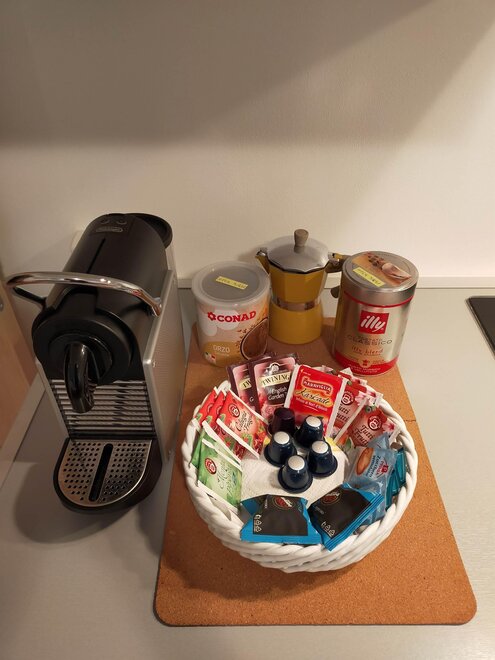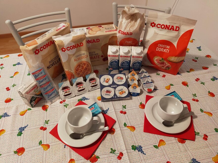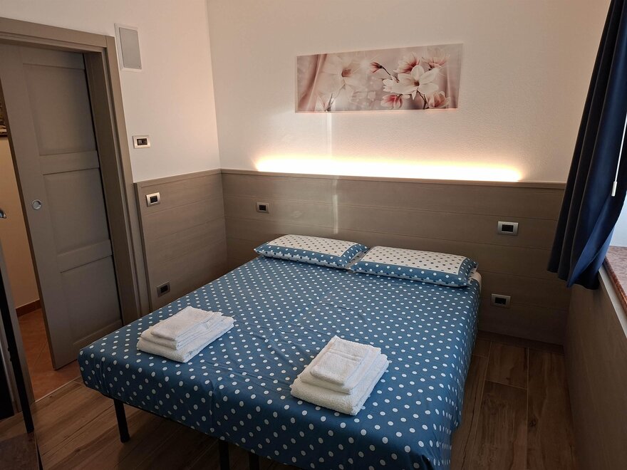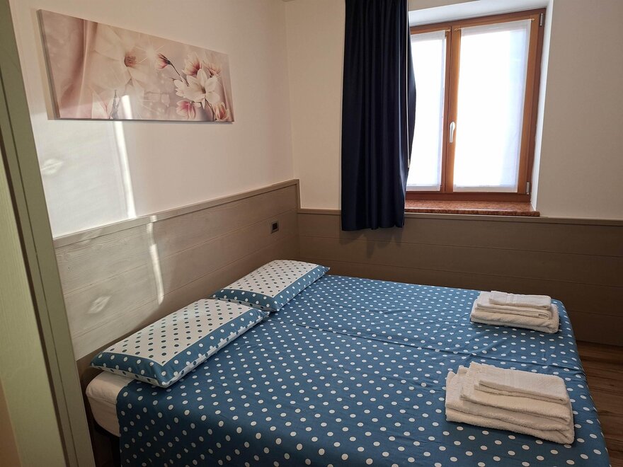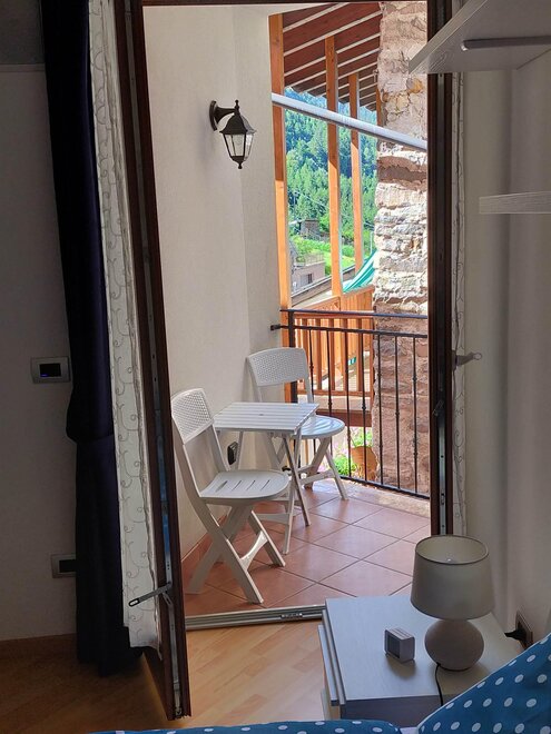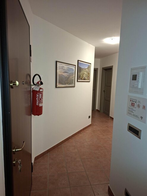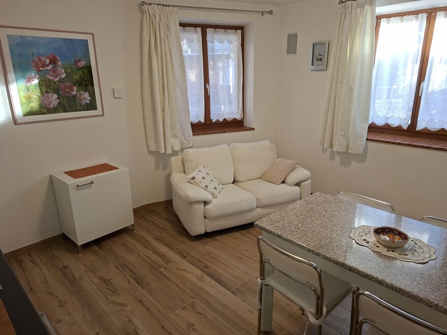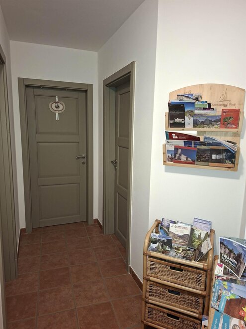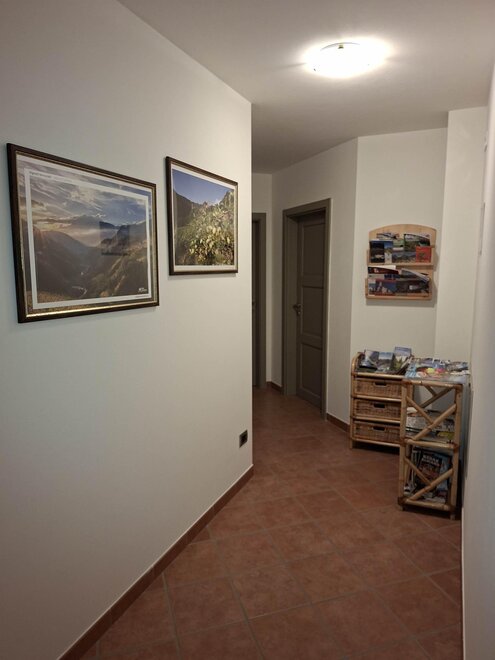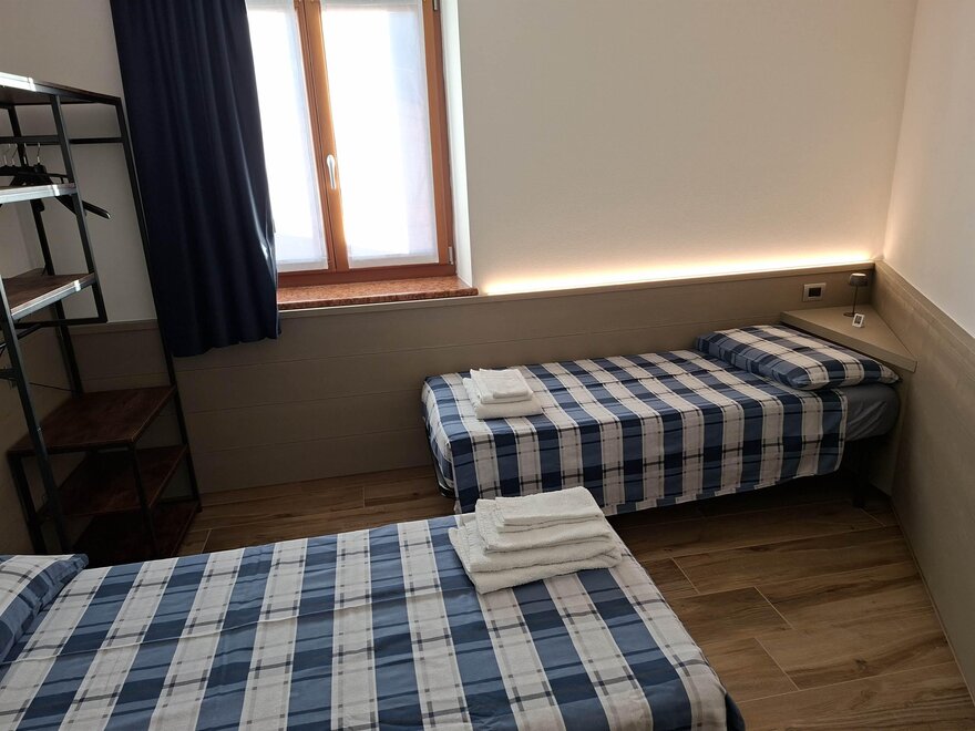 Ubytování se nachází v prvním patře, je vhodné pro 4 osoby, vybavené všemi pohodlími a skládá se ze dvou ložnic, jedné manželské ložnice s malým balkonem a jedné dvojité ložnice, která může na vyžádání přejít na dvě dvojité nebo dvě manželské. Koupelna s multi-funkční sprchou, fén, sprchový gel atd. Kuchyň je zařízena troubou, lednicí s mrazničkou, mikrovlnnou troubou, myčkou, plynovým sporákem, nádobím, příbory a kuchyňským textilem. Wi-fi zdarma, vyhrazené parkování na pozemku před domem, možnost uložit e-bike v garáži a provést nabíjení baterií. Najdete zde pračku, vysavač, žehličku a žehlicí prkno. V obývacím prostoru, kuchyňský kout, pohovka a smart-tv. Každý pokoj je vybaven individuálním topením, rádio tunerem. Ručníky a ložní prádlo jsou v ceně. Najdete zde také několik potravin na snídani a pro nejmenší je k dispozici vysoká židle a postýlka. Možnost přidání dalšího jednolůžka.