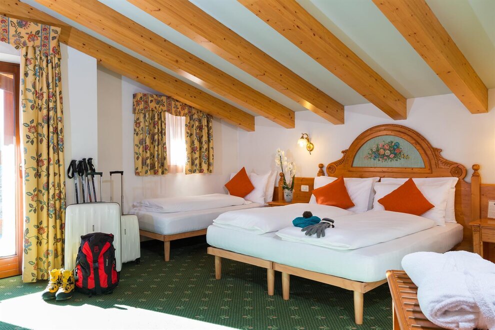 Pokoj zařízený v horském stylu s manželskou nebo dvojitou postelí (uveďte). Některé mají balkon, všechny mají LCD satelitní televizor s programy pay per view SKY, fén, připojení k internetu, trezor, telefon. Také poskytujeme večerní službu úpravy postelí.