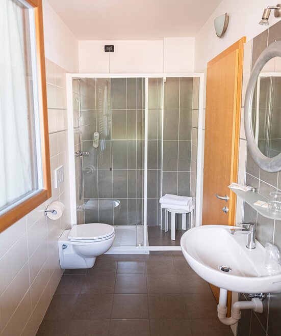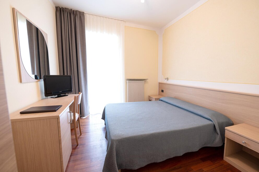 Prostorný pokoj, kompletně zrekonstruovaný, moderní, nová matrace h 22 cm, zvukotěsná okna, všechny s balkonem na straně třídy nebo zahrady, laminátová podlaha, trezor, telefon, LCD TV, koupelny s elegantními povrchy, některé s velkou sprchou a sprchovou hlavicí, toaletní potřeby a fén. Mohou ubytovat až 3 dospělé a mohou být rezervovány s manželskou postelí nebo také se třemi jednotlivými.