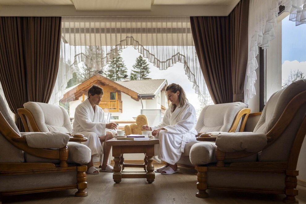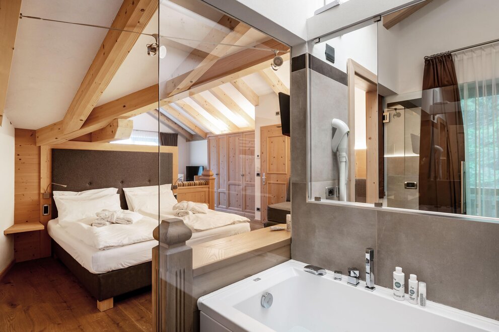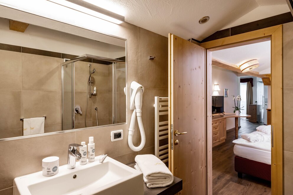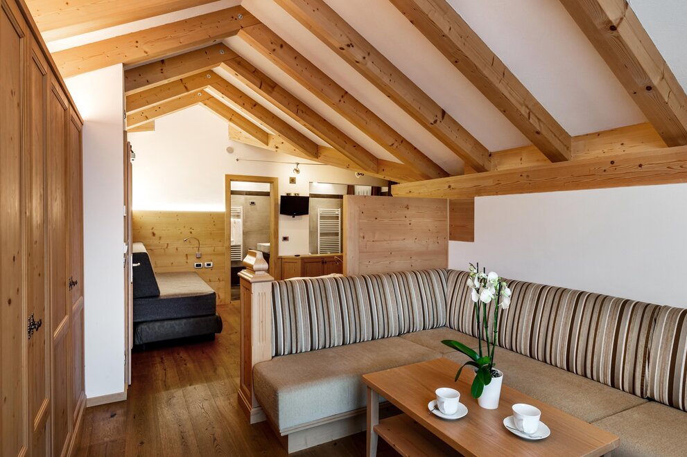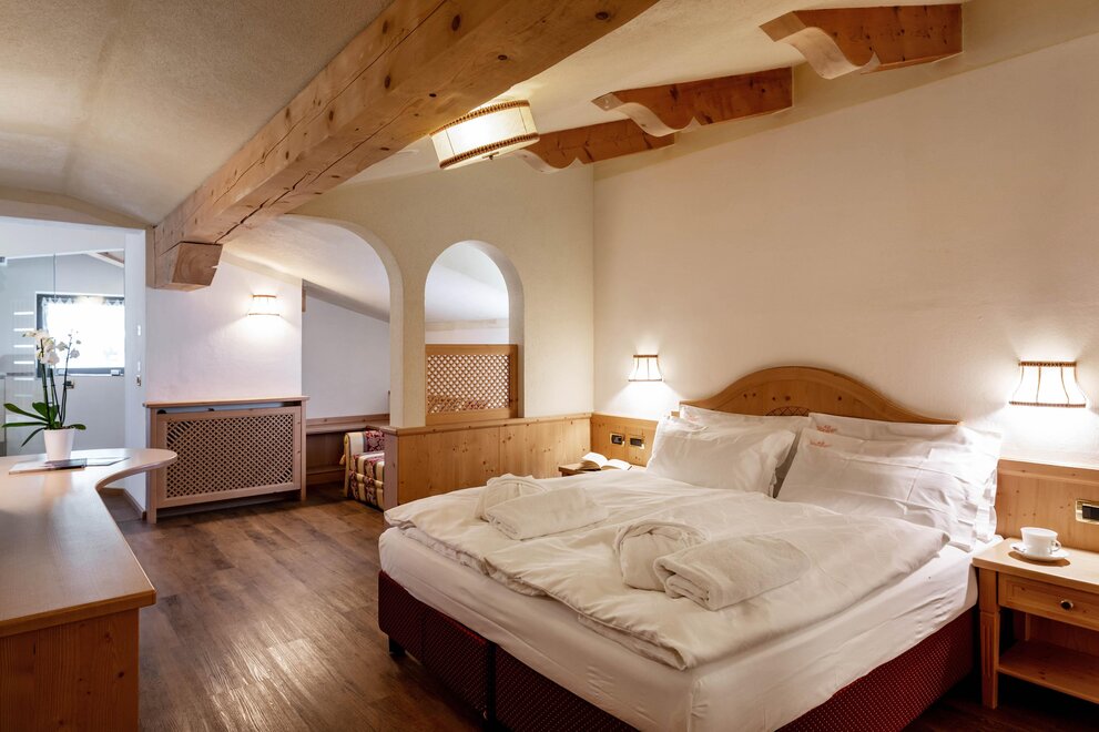 Prostorné a světlé pokoje, vhodné pro rodiny, zařízené v decentním a elegantním stylu. Disponují soukromými koupelnami s sprchou, fénem, satelitní televizí, trezorem, audio systémem a zimním topením s regulovatelnou teplotou a balkonem s výhledem na Dolomity. Malý dárek v podobě kosmetických produktů z řady Terme Dolomia, měkký župan a pantofle. Spa je pohodlně dosažitelné výtahem z pokoje.