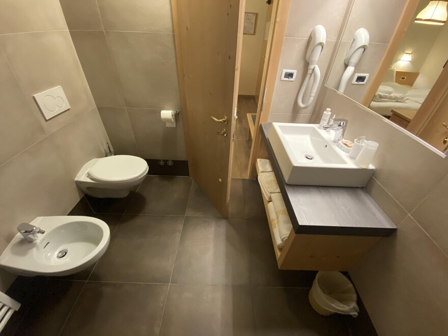 Malý dárek v podobě kosmetických produktů z řady Terme Dolomia, měkký župan a pantofle. Spa je pohodlně přístupné výtahem přímo z pokoje.Sanitární vybavení