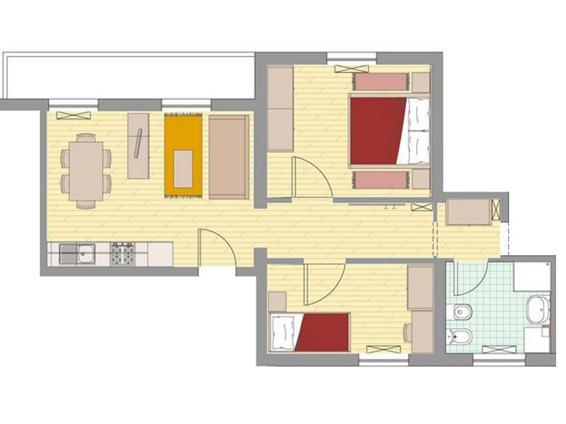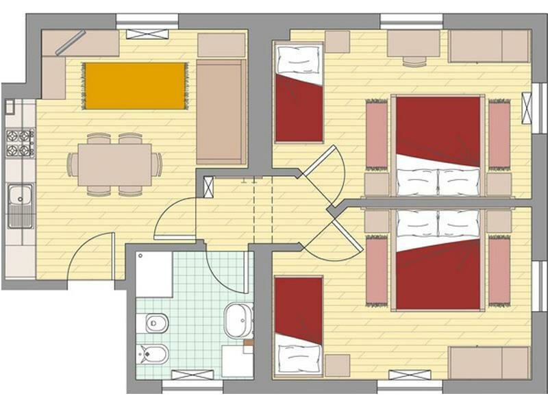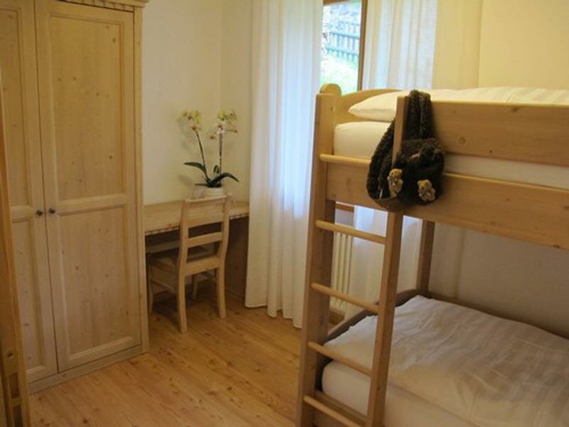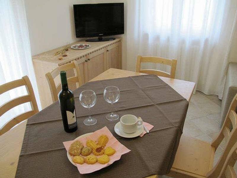CUCINA / SOGGIORNO kuchyňská sestava s korpusem v laminu barvy slonové kosti, fronty v barvě krémového dřeva s horizontálním žilkováním, hliníkové úchytky, tlumené panty, standardní koše, pracovní deska v laminátu barvy hnědého porfyru, hrana v barvě hnědého porfyru, hliníkový sokl, spotřebiče REX, dřezy a baterie FRANKE sestává z: stolu s kartáčovaným povrchem, židlí se sedadlem z dřeva, pohovky potažené látkou v barvě béžové, TV 32", vysoké lednice s mrazákem, vestavěné myčky, varné desky, trouby, mikrovlnné trouby, dřezu s baterií, digestoře, nádobí, talířů, nástrojů. CAMERE Nábytek vyrobený ze spáleného smrku, postele z masivního smrku se soupravou peřin, skříně z masivního smrku s čelním a bočním panelem, zrcadlové dveře, bronzové knobky.
