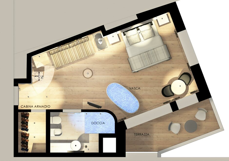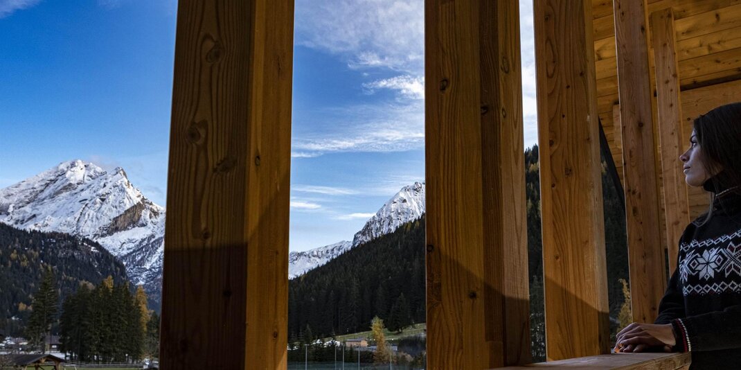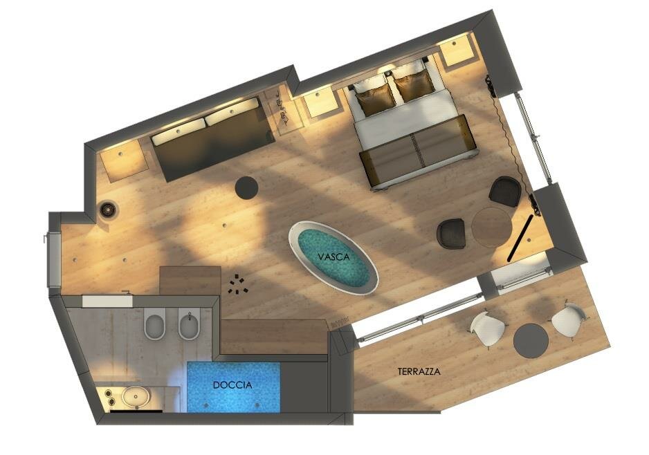 Dřevěná výzdoba z cirmolu a jemné odstíny cenných kůží vytvářejí v místnosti věnované krajinářskému malíři útulnou atmosféru. Jeho náměty se utkávají o pohled s údolím, které nabízí výhled, který si můžete plně vychutnat při západu slunce, poté co jste povzbudili smysly pomocí chromoterapie v relaxační sprchě.