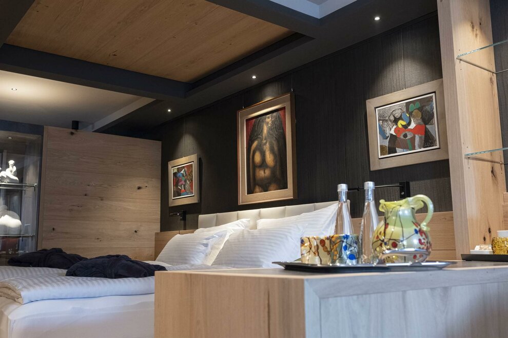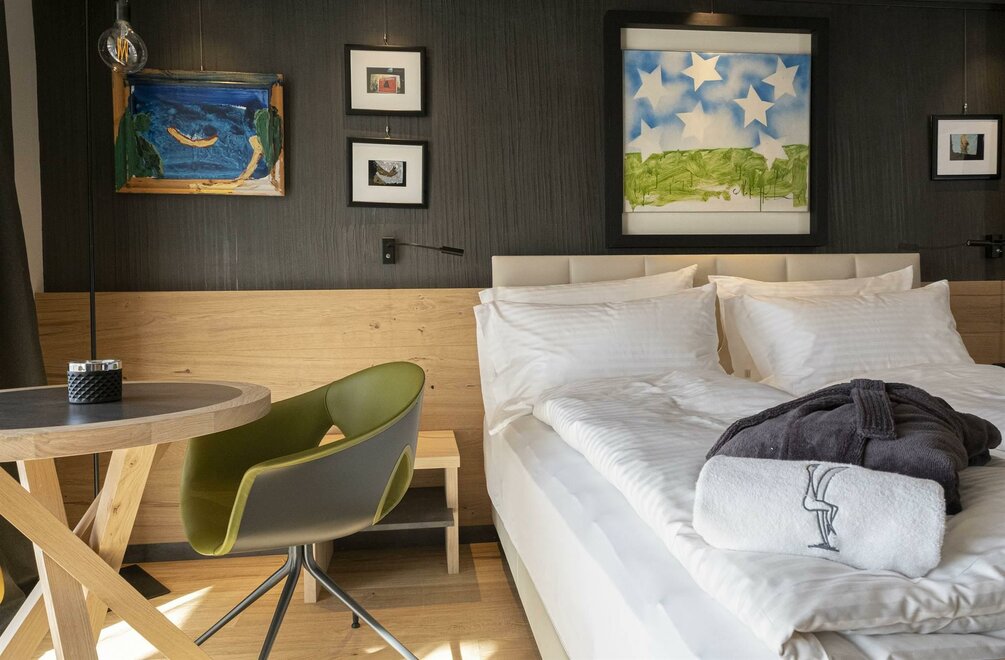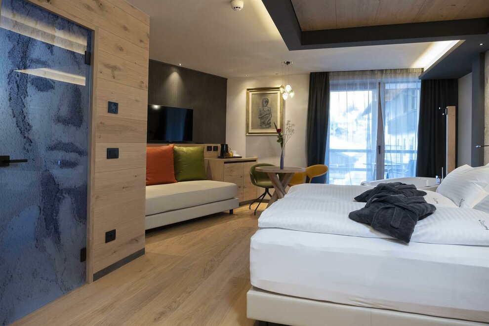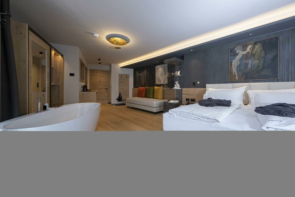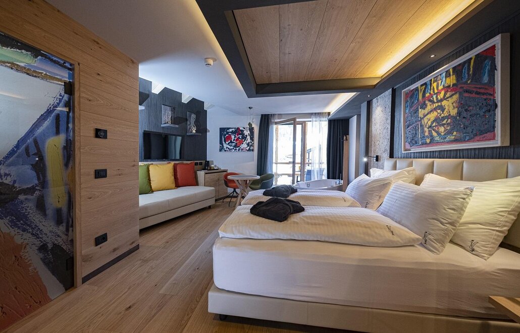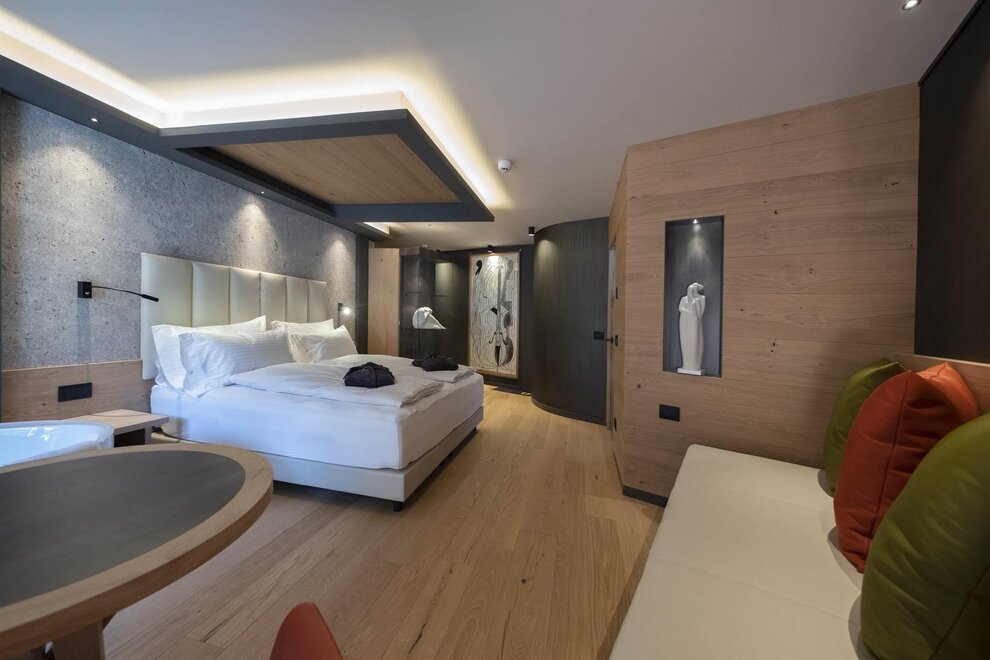 Esenciální a ostré obrazy a sochy Winklera zabírají tuto Junior suite se severským osobitým stylem. Hojná světla zdůrazňují jeho jednoduchý a elegantní styl. Pohodlná pohovka je ideální náručí, kde si můžete užít okouzlující dolomitskou scénu. Kouzlo, které si můžete dopřát i během zdravého odpočinku ve vířivce.