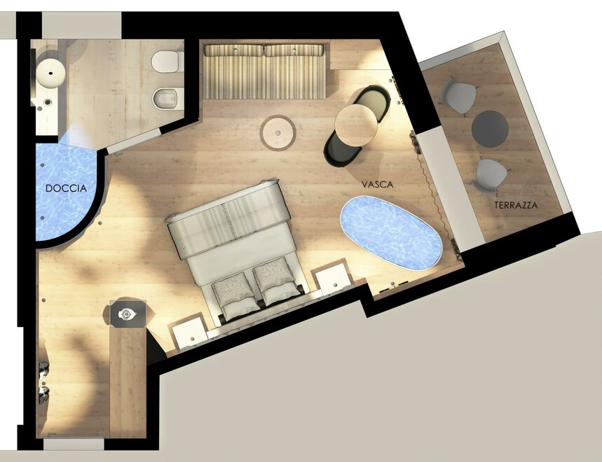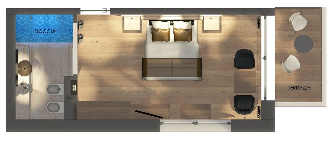 Junior suite s výraznou osobností, ve které odstíny modré vyzařují klid a harmonii. Kouzelný les parní lázně naznačuje magii legend inspirovaných Dolomity, jejichž svahy se večer rozsvěcují za širokými okny