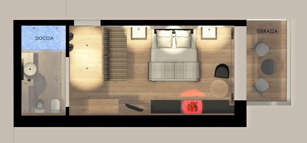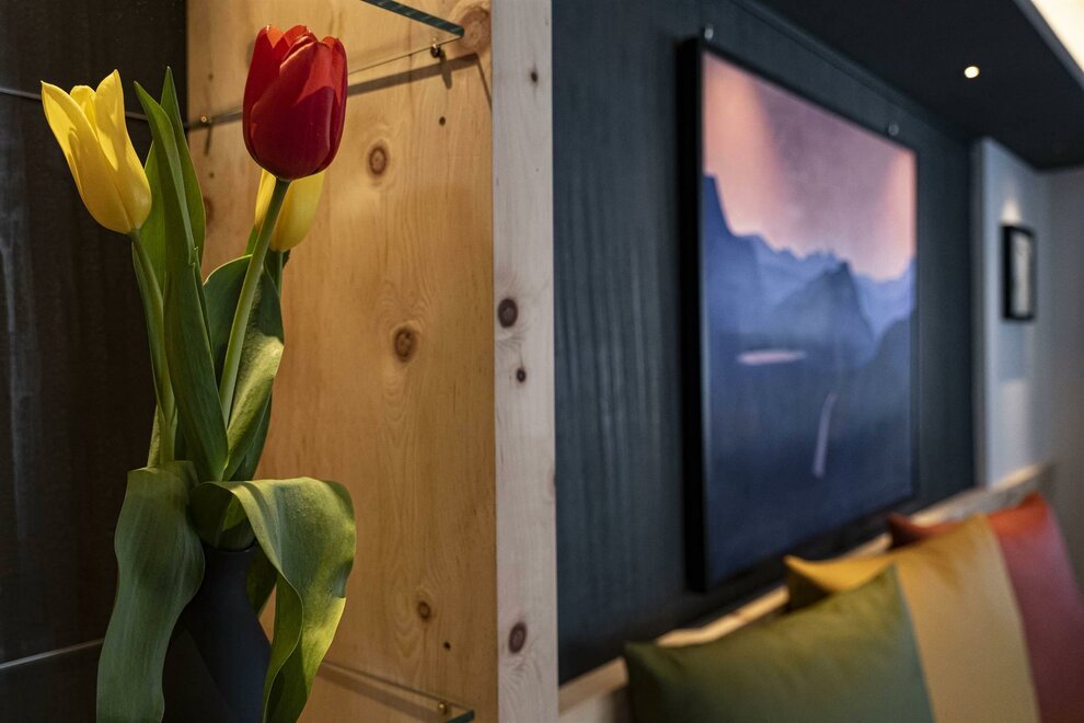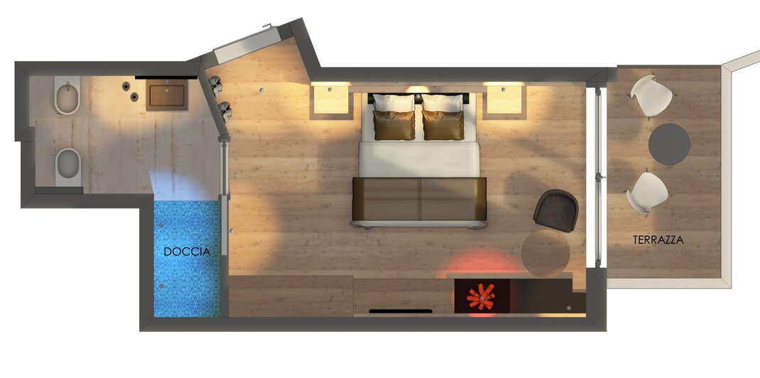 Emoce nechybí v tomto pokoji s futuristickým kouzlem. Po dni stráveném venku a uvolňující sprše vás teplé deperovské barvy a veselý praskající oheň zahřejí na duši i srdci. Obraz barevné hory na římsě nad postelí zaručuje radostné probuzení. Dobré ráno Canazei!