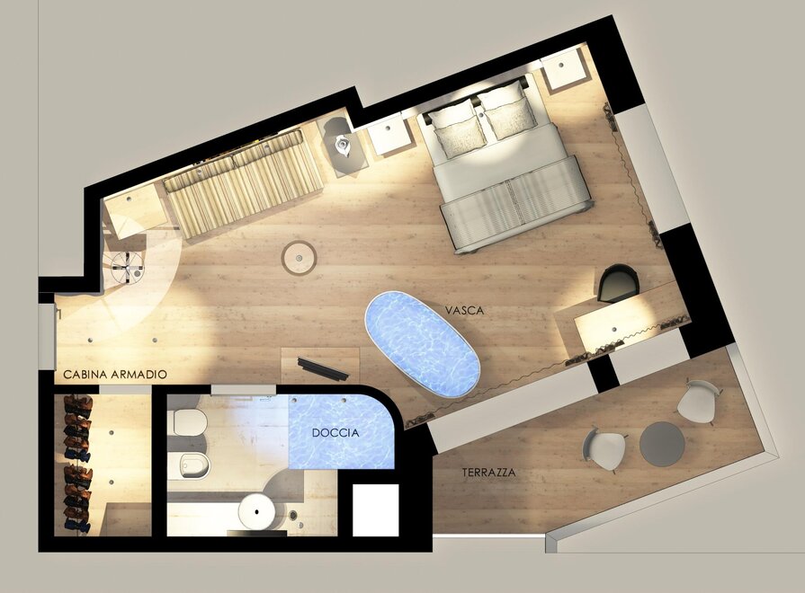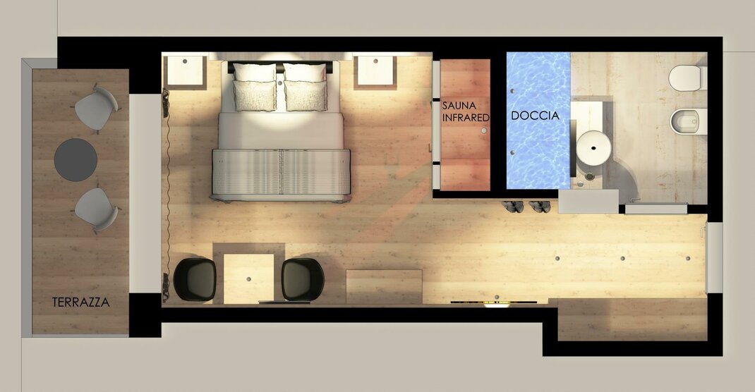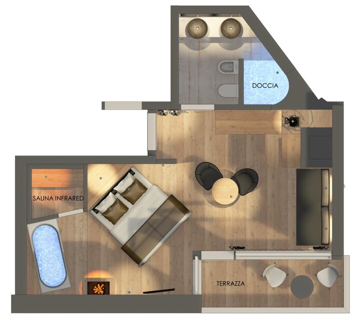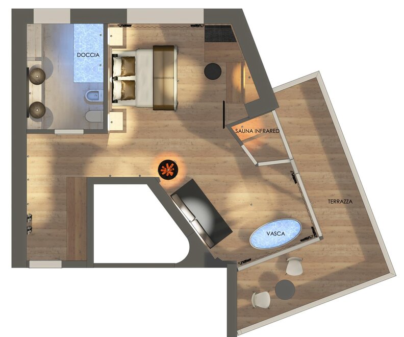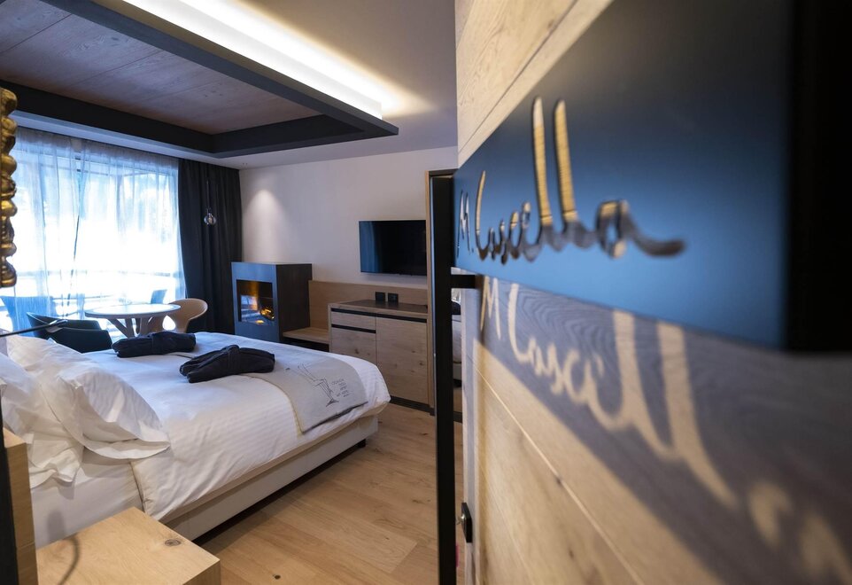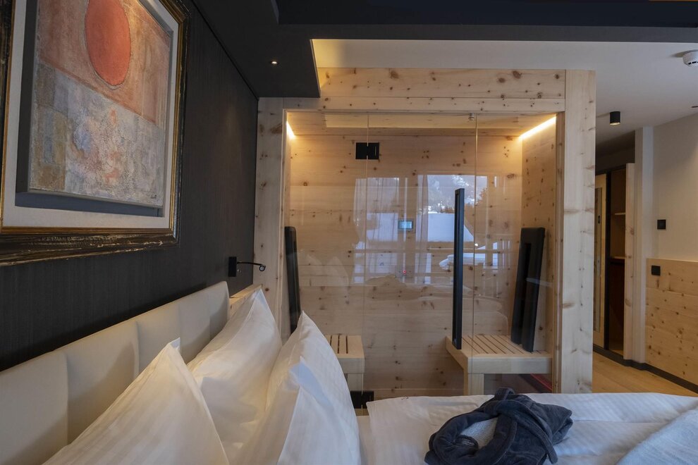 Dřevěné obložení, oheň, sauna ze stejného dřeva s výhledem na údolí. Teplo pohostinnosti se nejlépe projevuje v této prostorné a světlé Junior suite. Světlo zvýrazňuje esenci děl Costazzy, do kterých se můžete nechat zahalit v měkkém objetí.
