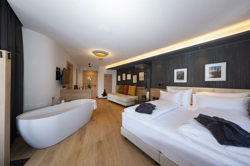 VLASTNOSTI: Soukromý balkon s výhledem na hory - Matrace vysoké kvality - Volně stojící vana s hydromasáží - Šatna - Minibar a trezor - Smart TV vícejazyčná