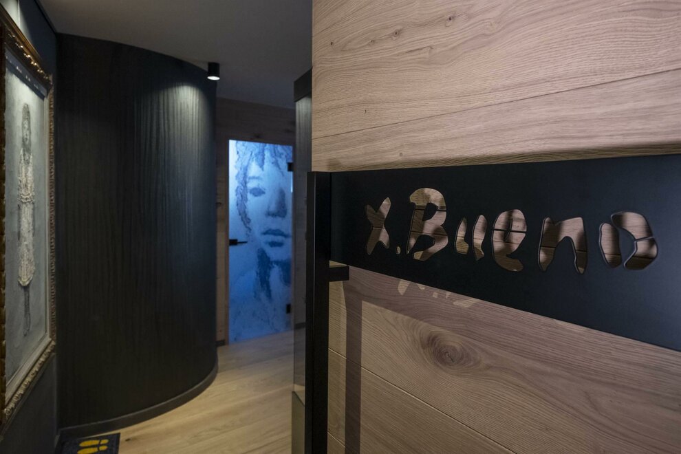 Portréty umělce z Trentina jsou nákazlivé pro ty, kdo je pozorují z pohodlného obývacího pokoje. Odvážné barvy a silná osobnost přinášejí radost a vyvolávají pozitivní podněty umocněné tvrdostí materiálů jako je železo a dolomit. Kromě balzámového blahobytu vířivky tato místnost zaručuje nabití radostnou krásou.