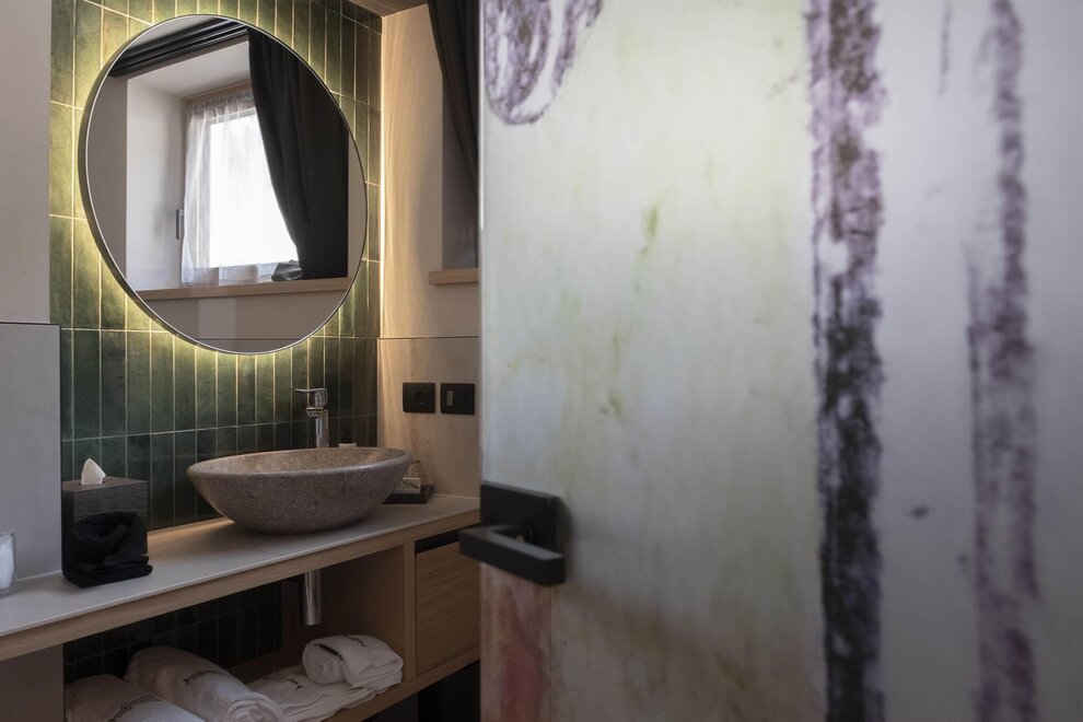 Umění a příroda se setkávají v pokoji, kde se zelená odráží od obrazů do koupelny až po okolní lesy. Doloň z obložení evokuje sílu hor a jejích obyvatel, kteří se pohybují za širokými okny. Vířivka slibuje chvíle naprosté relaxace, které lze stvrdit večeří při svíčkách v kouzelném obytném koutku.
