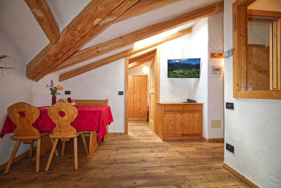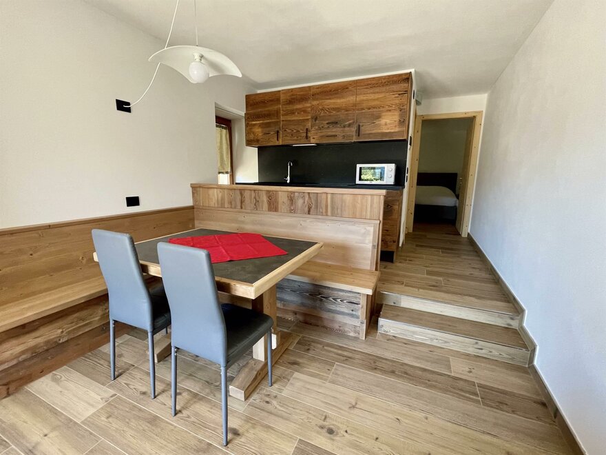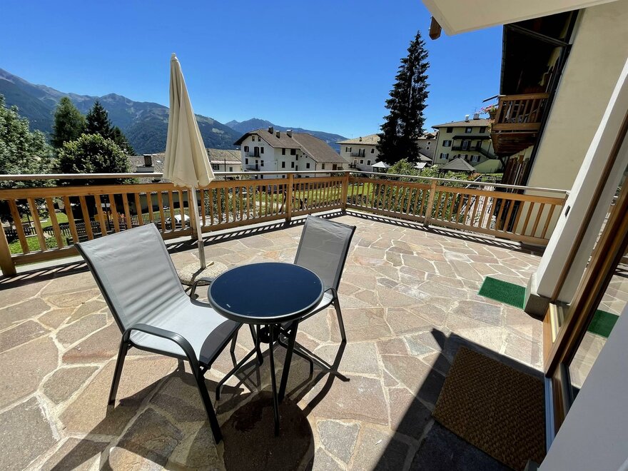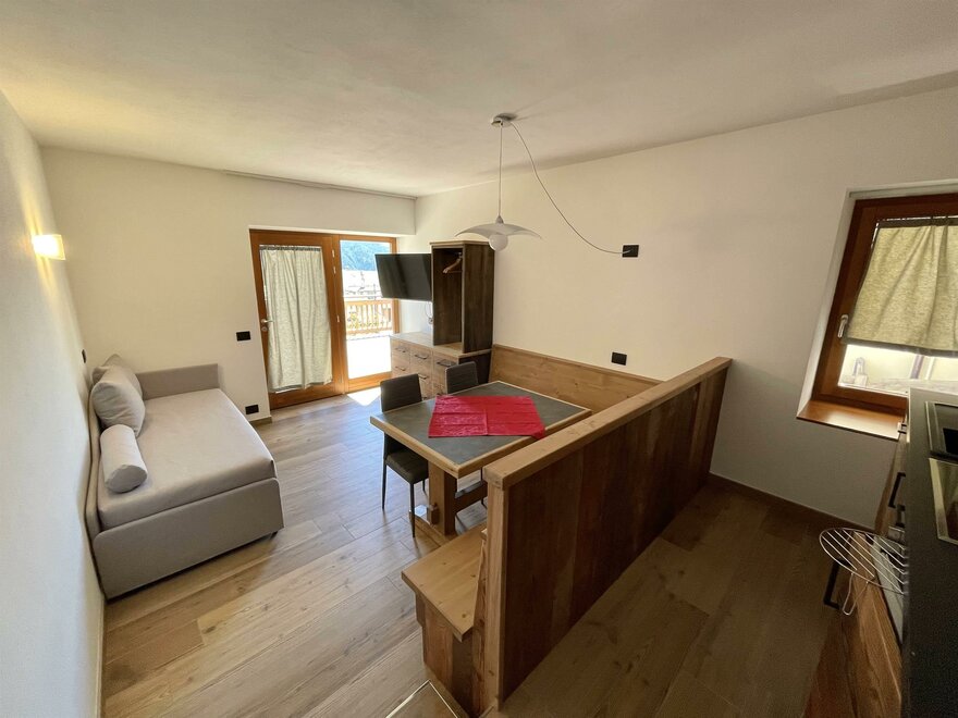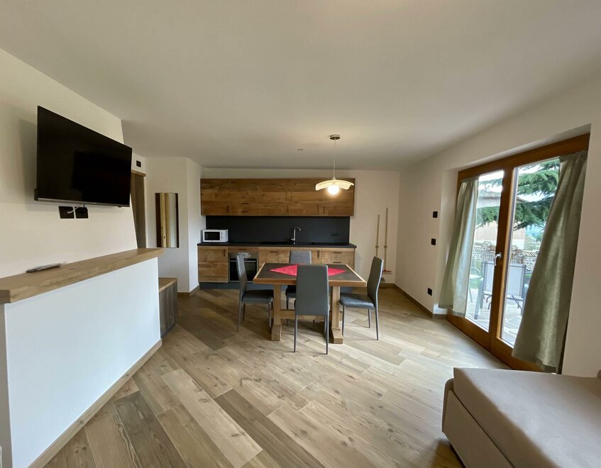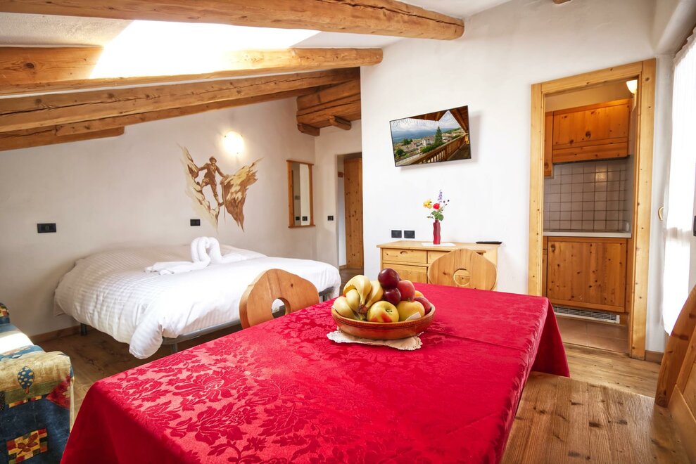 Byt s terasou v prvním/přízemním patře našeho domu Fabiolin, zrekonstruovaného v roce 2022, se nachází v slunečné a klidné oblasti s výhledem na údolí hor Catena del Lagorai, je velmi dobře zařízený a disponuje manželskou ložnicí, kuchyní/obývacím pokojem s rozkládací pohovkou, koupelnou se sprchou.