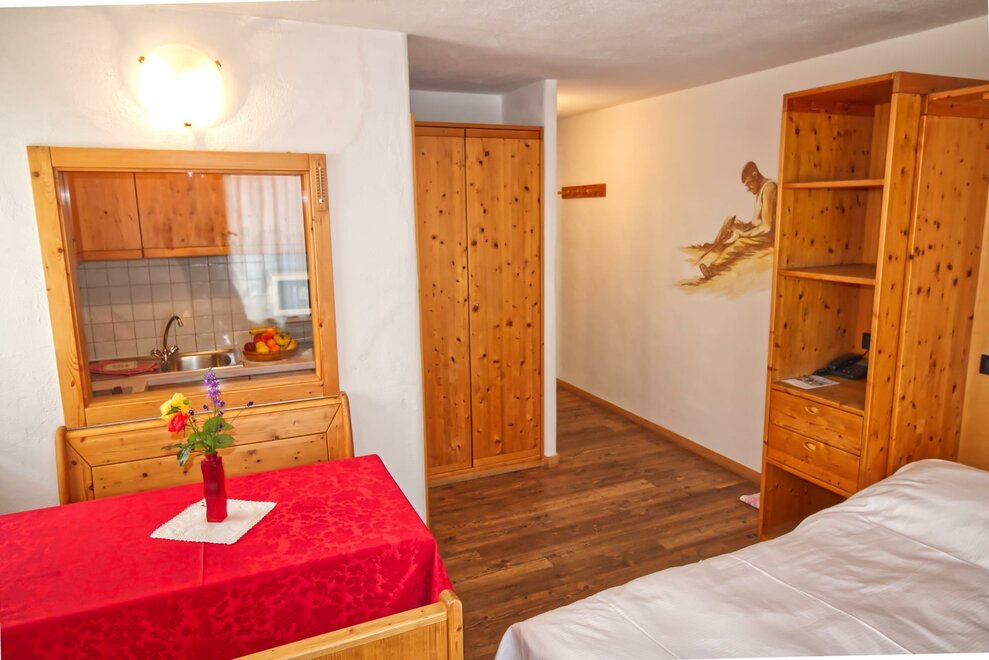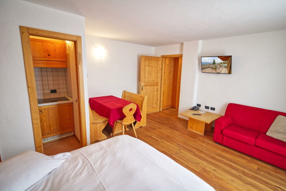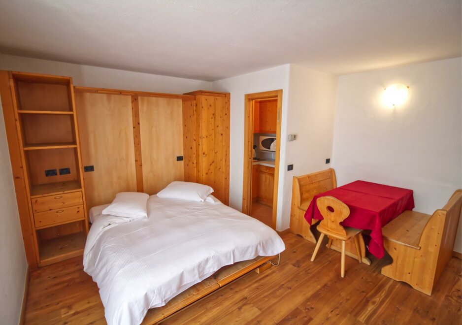 Naše studia měří od 25 do 30 metrů čtverečních v závislosti na kapacitě a skládají se z obývací/jídelní zóny, oddělené kuchyňky s elektrickými plotnami, manželské postele na sklápění a balkonu. Soukromé služby se sprchou. Ve studiích pro 3 a 4 osoby naleznete pohodlnou pohovku, třetí postel nebo patrovou postel oddělenou od obývacího pokoje skládacími dveřmi.