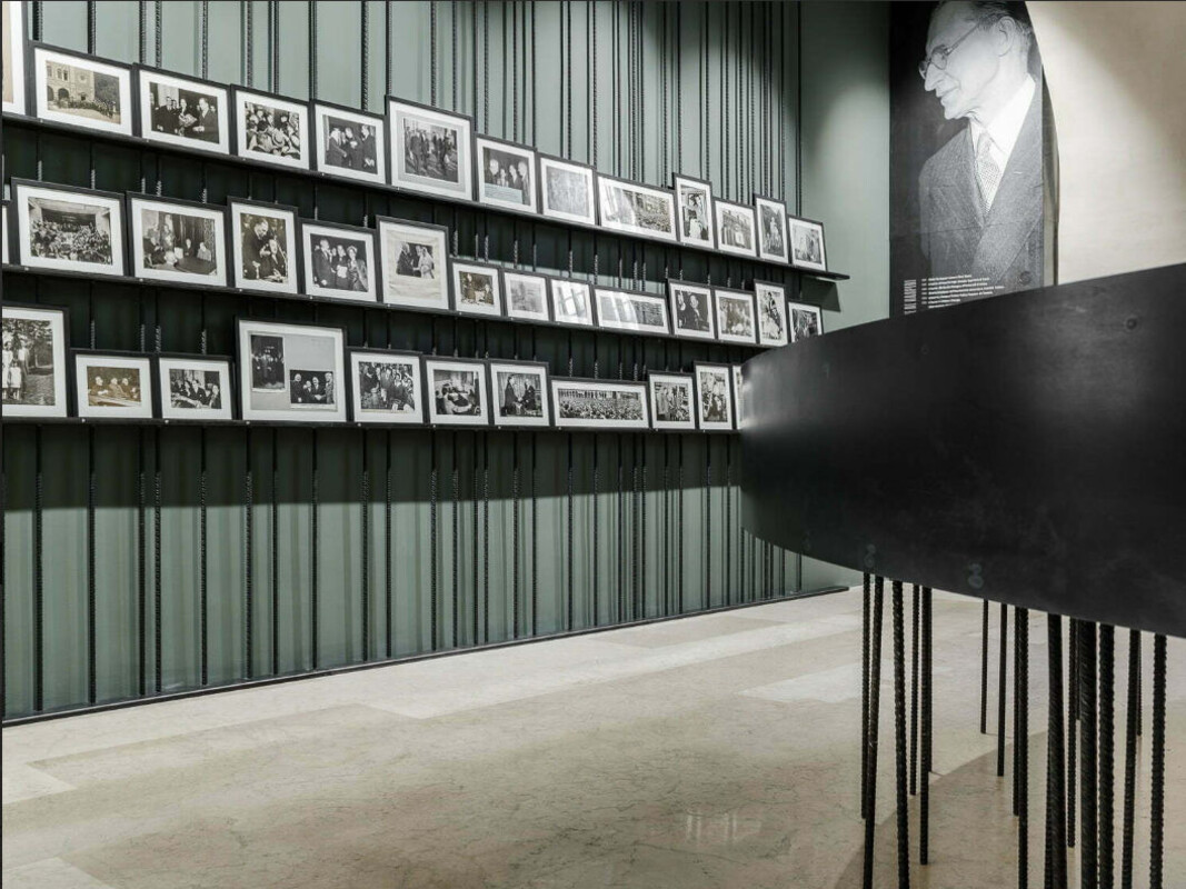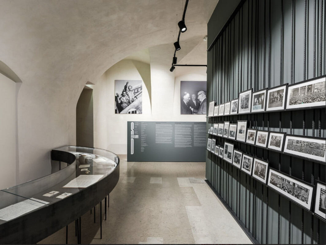 Die gesamte biografische Geschichte von Alcide De Gasperi lebt in einer Einrichtung auf, die die Idee eines Familienarchivs in einer stilisierten, zeitgenössischen Form zurückgibt, die die im Original ausgestellten Dokumente aufwertet.
