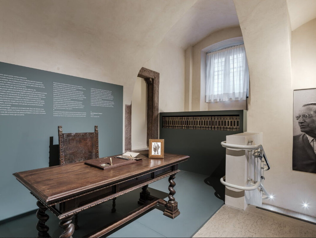 In einem separaten, aber für Besucher sichtbaren Raum kann der persönliche Schreibtisch bewundert werden, den Alcide De Gasperi täglich in der Wohnung in Rom in der Via Bonifacio VIII (jetzt Via Alcide De Gasperi) benutzte, bis er verschwand.