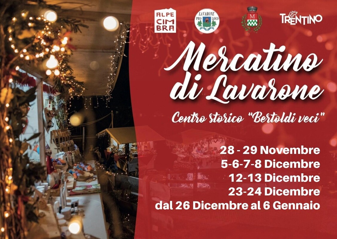 Ab dem 28. November findet in der wunderschönen Kulisse der Altstadt von "Bertoldi veci" die sechste Ausgabe des "Mercatino di Lavarone" statt, organisiert von der örtlichen Pro Loco. Wo: Fr. Bertoldi veci Wann: 28.-29. November; 05.-06.-07.-08. Dezember, 12.-13. Dezember, 19.-20. Dezember, 23.-24. Dezember und vom 26. Dezember bis 06. Januar 2027. Uhrzeiten: von 11:00 bis 19:00 Uhr. Weitere Informationen: APT Alpe Cimbra 0464 724130 info@alpecimbra.it