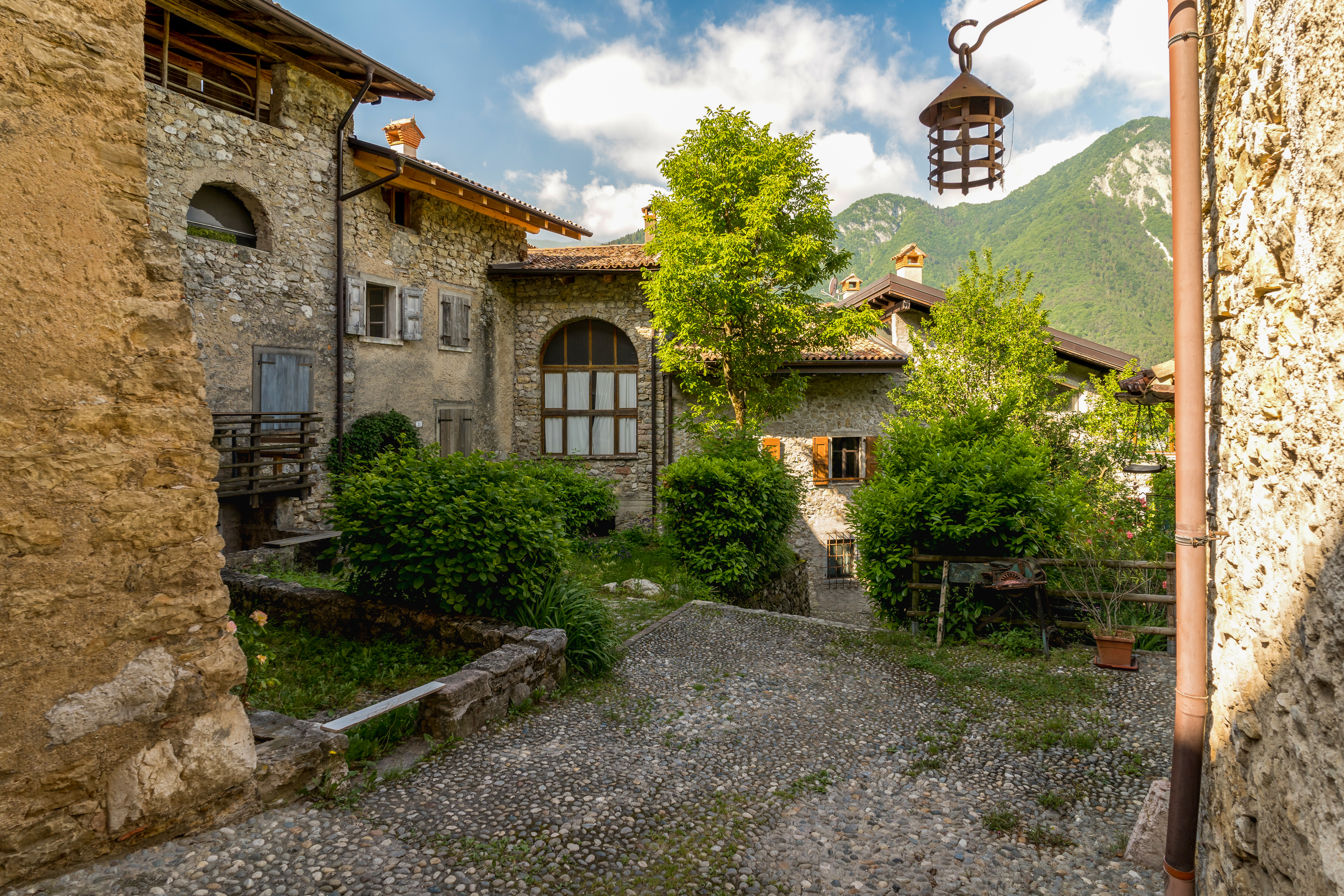 Der Kanal des mittelalterlichen Dorfs Tenno. Man spaziert über gepflasterte Wege, die vom charakteristischen Äußeren antiker Steinhäuser gesäumt werden, unter Bögen, Arkaden und robusten Mauern, die die Wohnsitze miteinander verbinden. Eine der Wahrzeichen des Dorfes, das auch im Ausland bekannt ist, ist das Künstlerhaus „Giacomo Vittone“, in dem von März bis Dezember Ausstellungen und künstlerische Veranstaltungen stattfinden. Die Locanda del Borgo auf dem zentralen Platz ist der richtige Ort für einen Snack und um die echte Spezialität dieser Gegend zu probieren: Carne Salada und eine ideale Beilage aus Fasoi, d. h. Bohnen, oder anderen Null-km-Gerichten. Eine Alternative ist das Restaurant Antica Croce in Tenno.