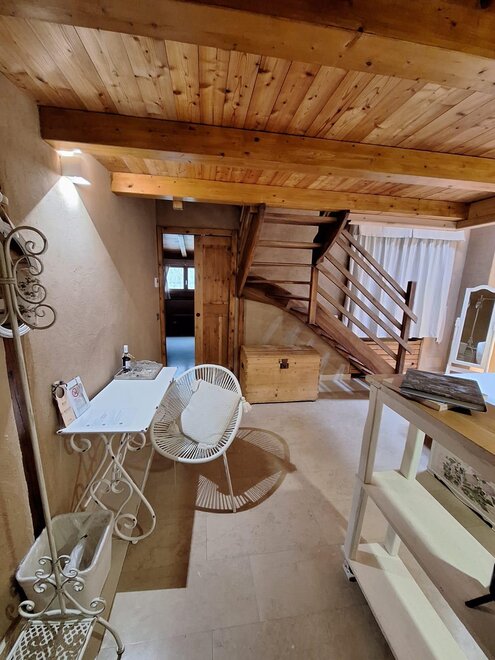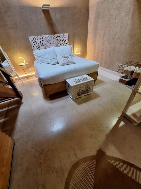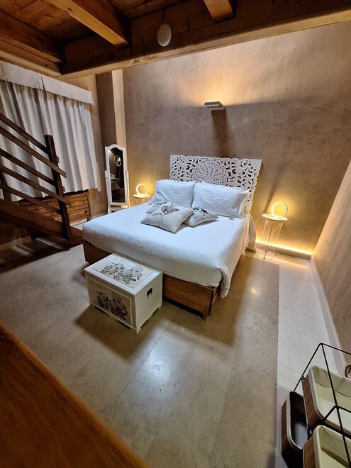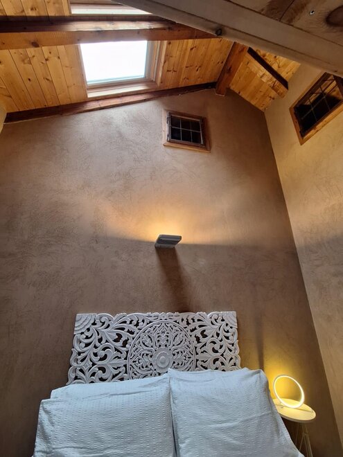 Die Wände sind aus Ton und die Möbel sind mit altem Holz von Hand gefertigt.