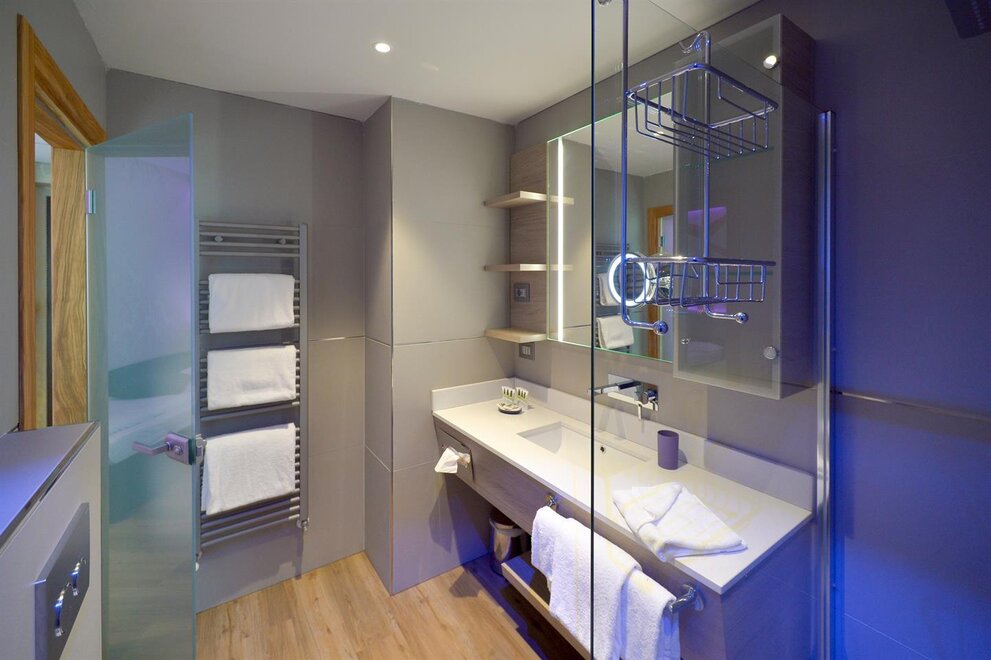 - Badezimmer mit Dusche, weicher Frotteewäsche und umweltfreundlichen Badeprodukten im Spender