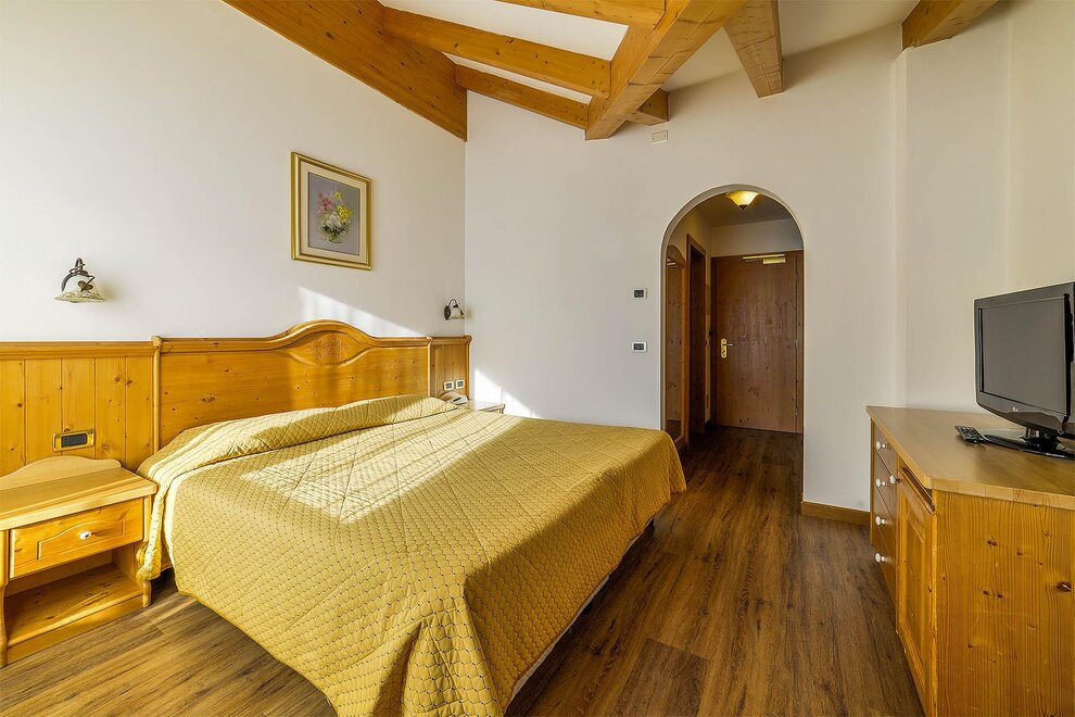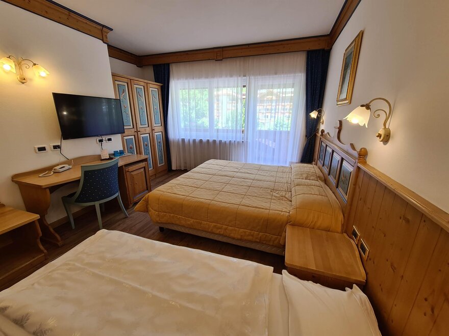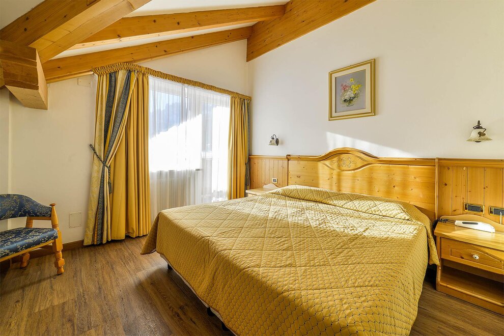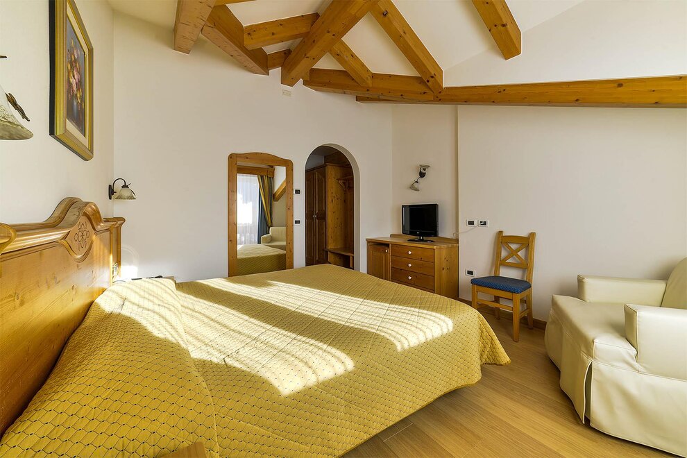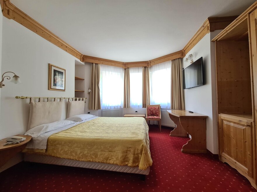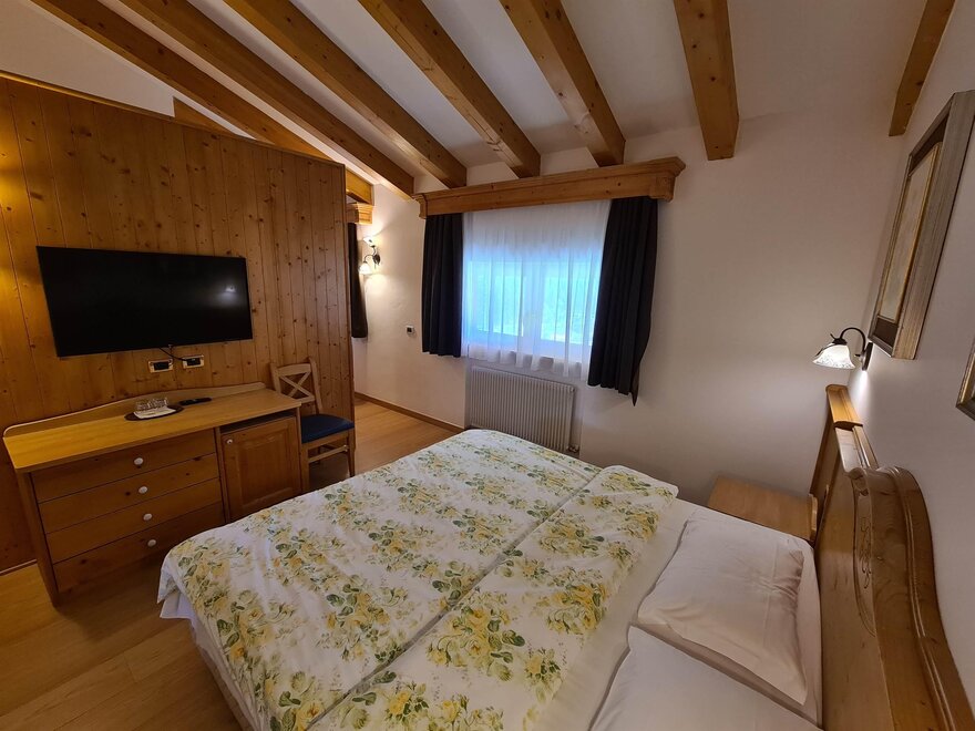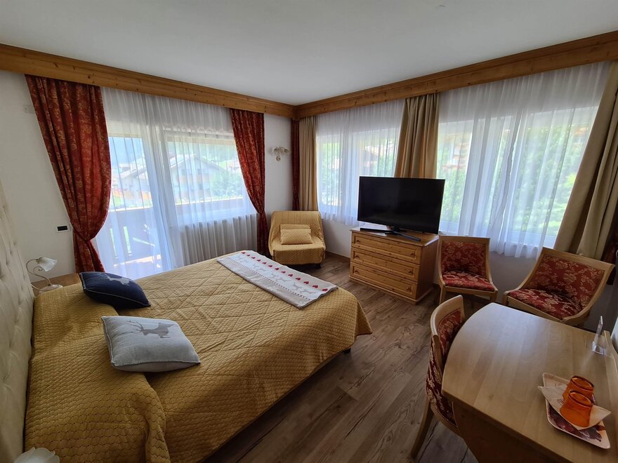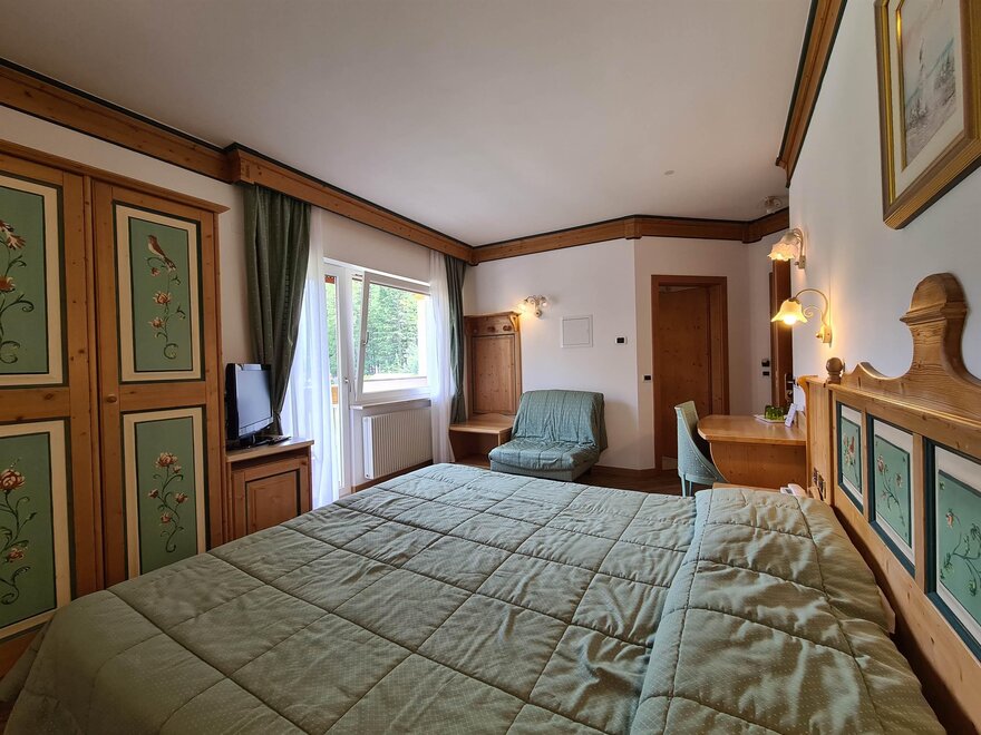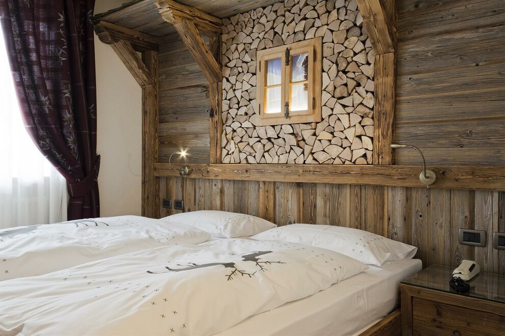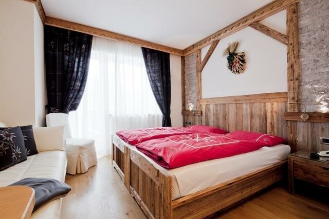 ein aus dem typischen alten Holz der Hütten unserer Berge gestaltetes und immer wieder anders dekoriertes Zimmer. Äußerst bequeme Betten mit weichen Daunenfederbetten oder antiallergischen Decken. Großer Panoramabalkon, Bad, Toilettenartikel, Haartrockner, Safe, Telefon, 26“-Sat-TV, Wi-Fi-Internet.