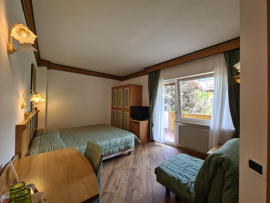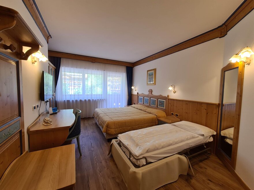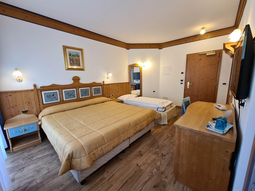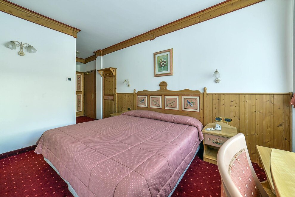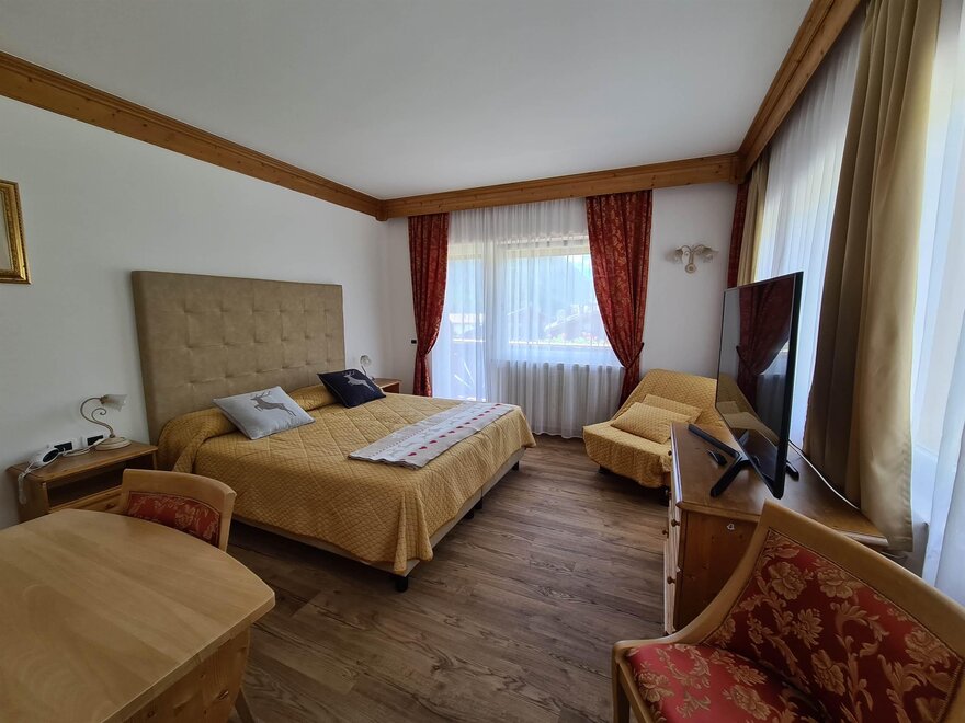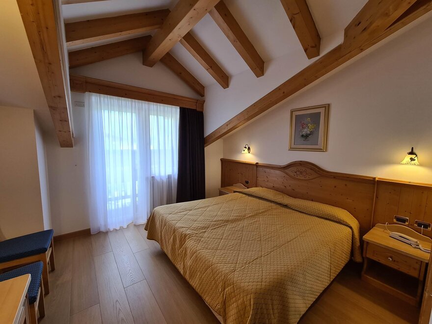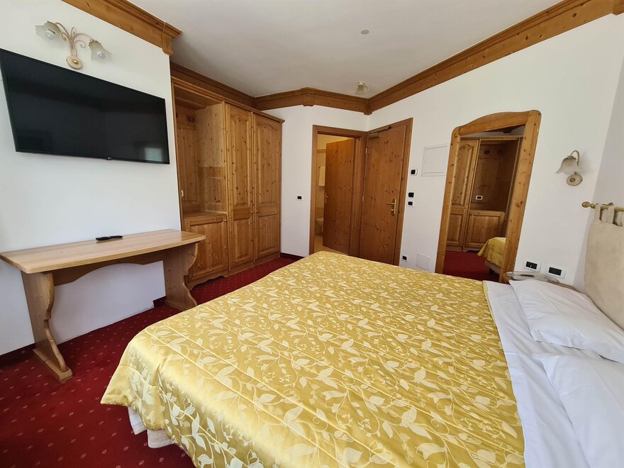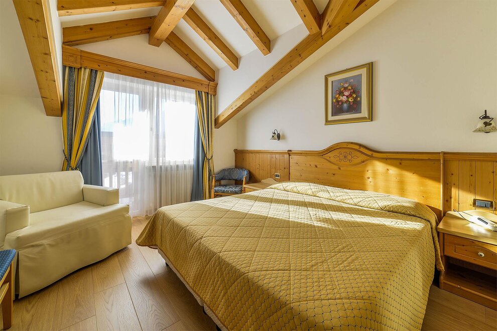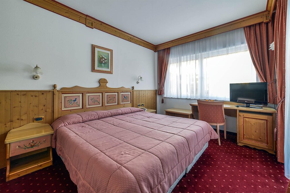 ein aus dem typischen alten Holz der Hütten unserer Berge gestaltetes und immer wieder anders dekoriertes Zimmer. Äußerst bequeme Betten mit weichen Daunenfederbetten oder antiallergischen Decken. Großer Panoramabalkon, Bad, Toilettenartikel, Haartrockner, Safe, Telefon, 26“-Sat-TV, Wi-Fi-Internet.