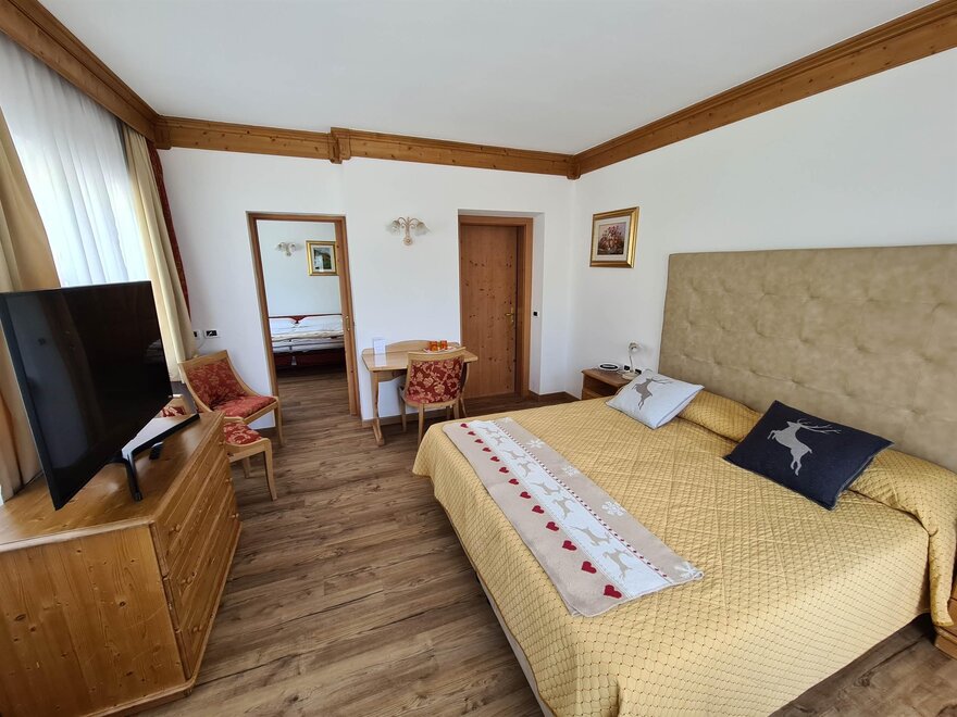 Vierzig Quadratmeter Platz für dieses geräumige, elegante und mit Liebe zum Detail gestaltete Zimmer, von dem aus man das wunderbare Panorama des Langkofels und des Sass Pordoi bewundern kann. Es verfügt über ein Himmelbett, einen Wohnbereich im Turm des Hotels mit Doppelausziehcouch, zwei Bäder, weichen Bademantel, Safe, CD-Player, Telefon und Wi-Fi Internet. Dazu großer Panoramabalkon nach Südwesten, Toilettenartikel, Haartrockner, 26“-Sat-TV, Minibar.