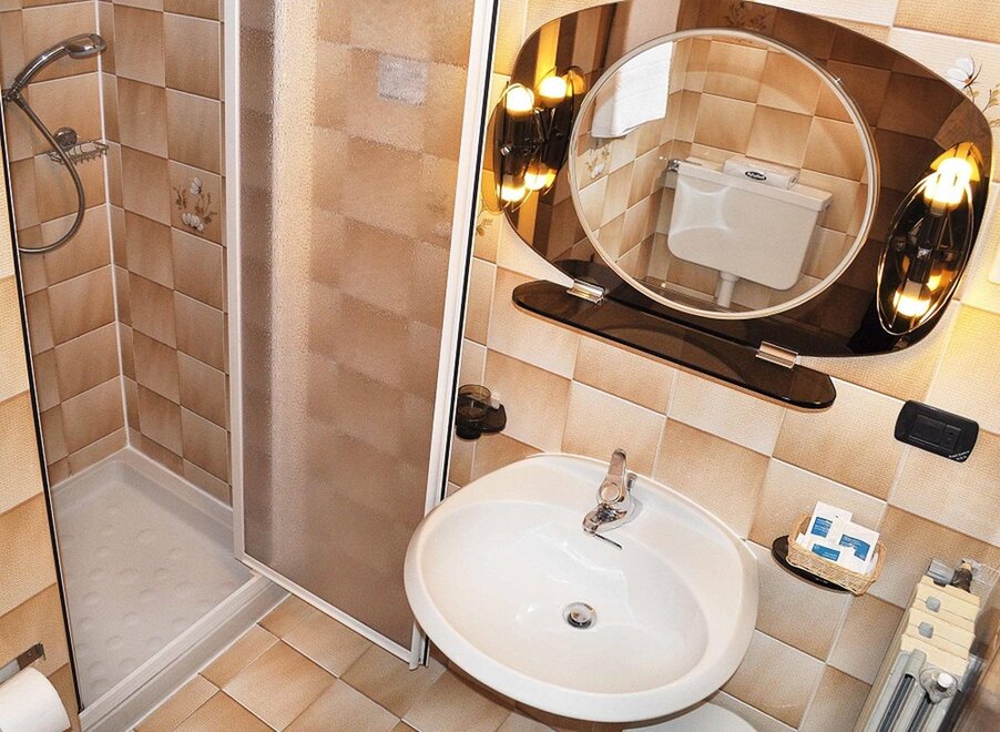 Komfortables Zimmer mit eigenem Bad mit Dusche, Bidet und Haartrockner.