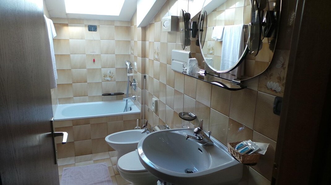 Zimmer mit eigenem Bad mit ¾ Badewanne, Bidet und Haartrockner.