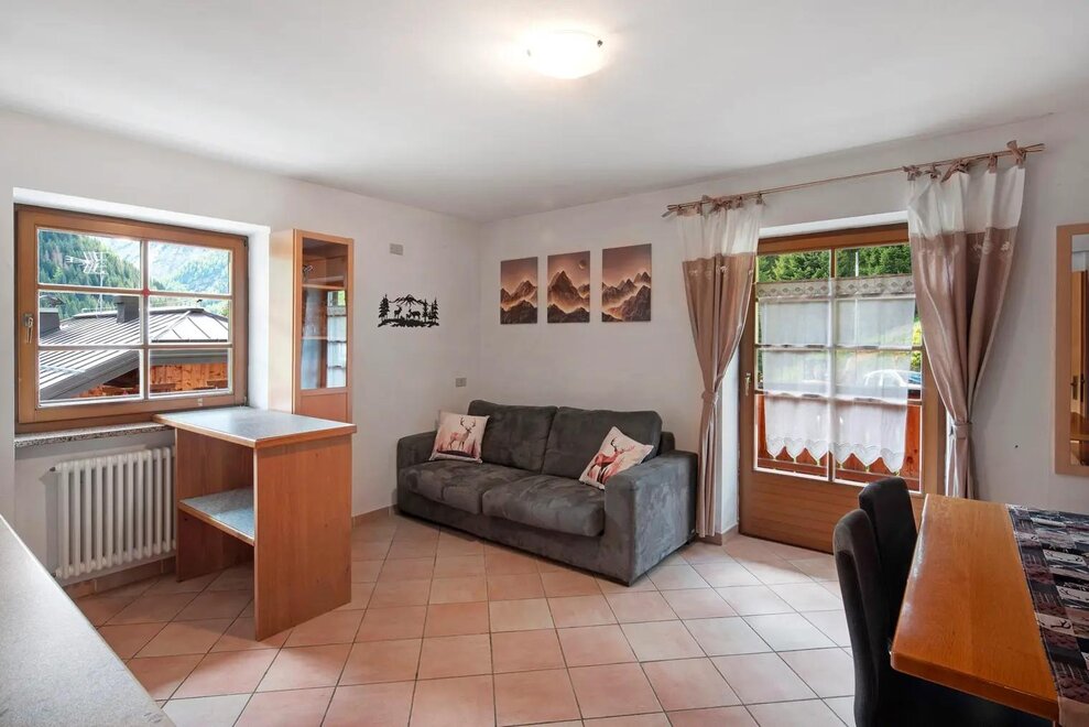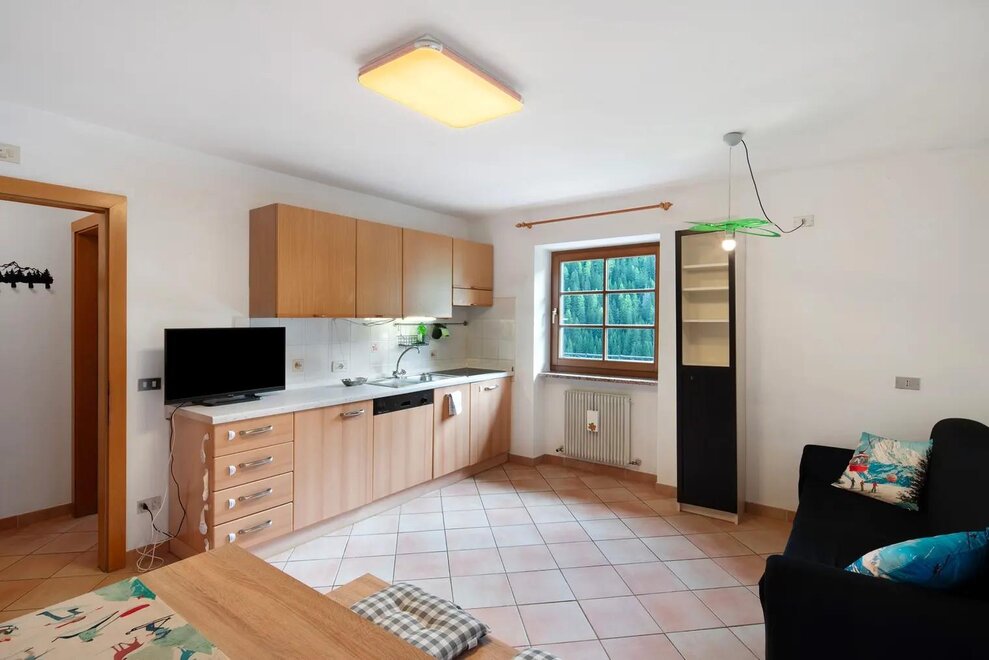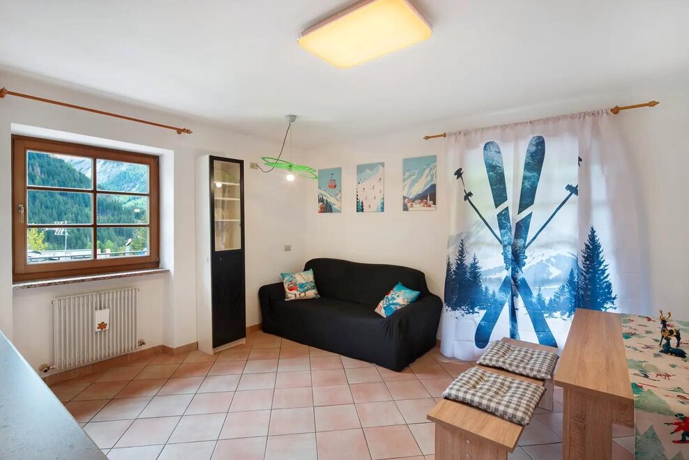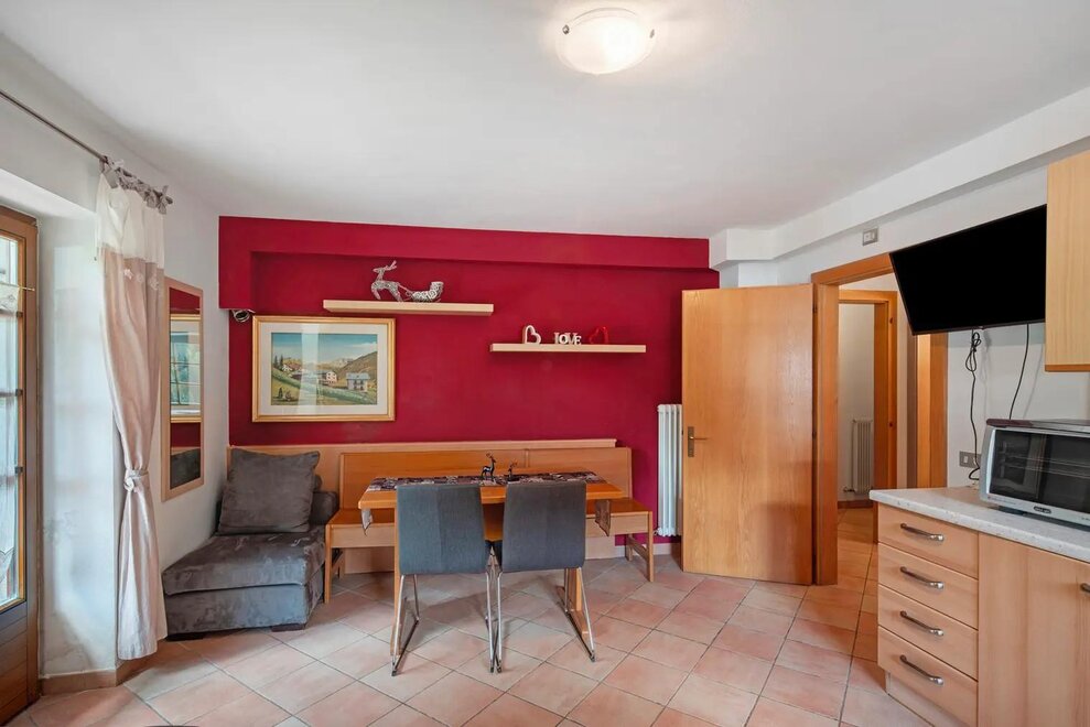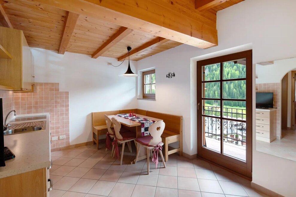Zweizimmerwohnung in Alba di Canazei im ersten Stock mit Wohnküche, Doppelzimmer und Badezimmer. Zwei Balkone bieten einen herrlichen Blick auf unsere Berge.