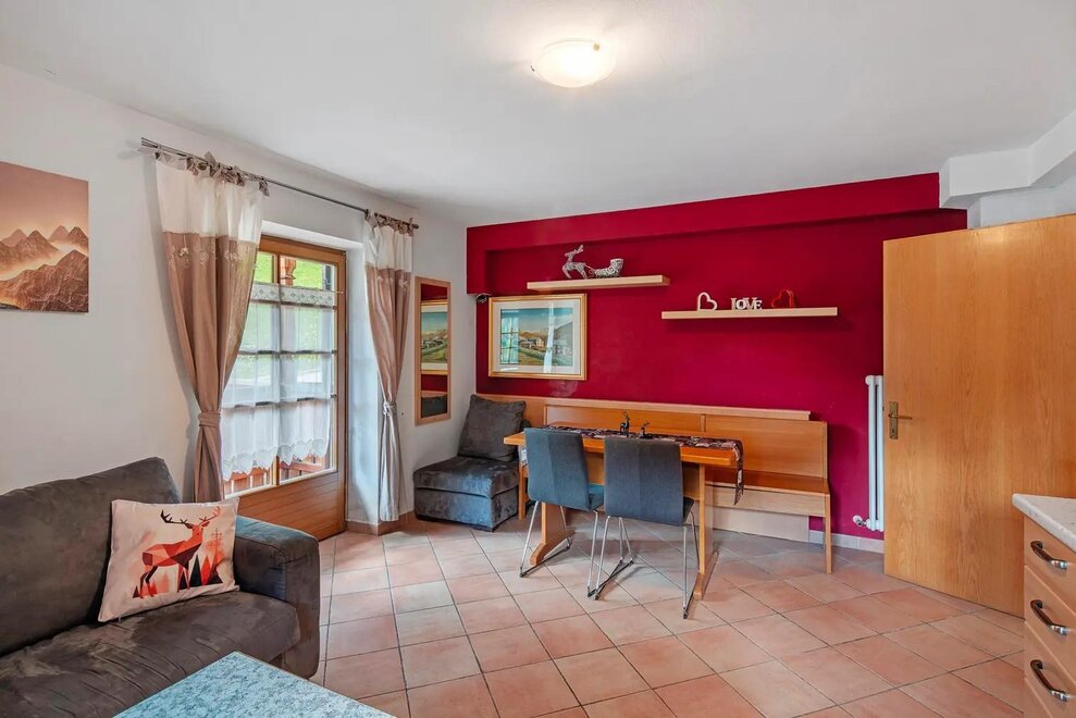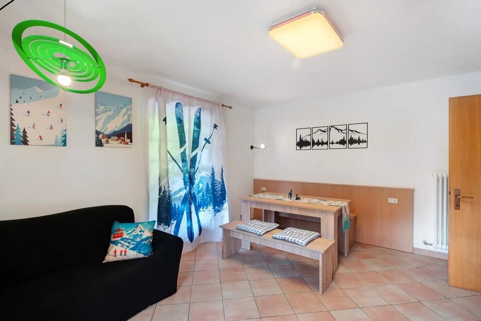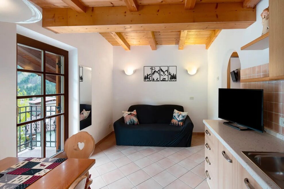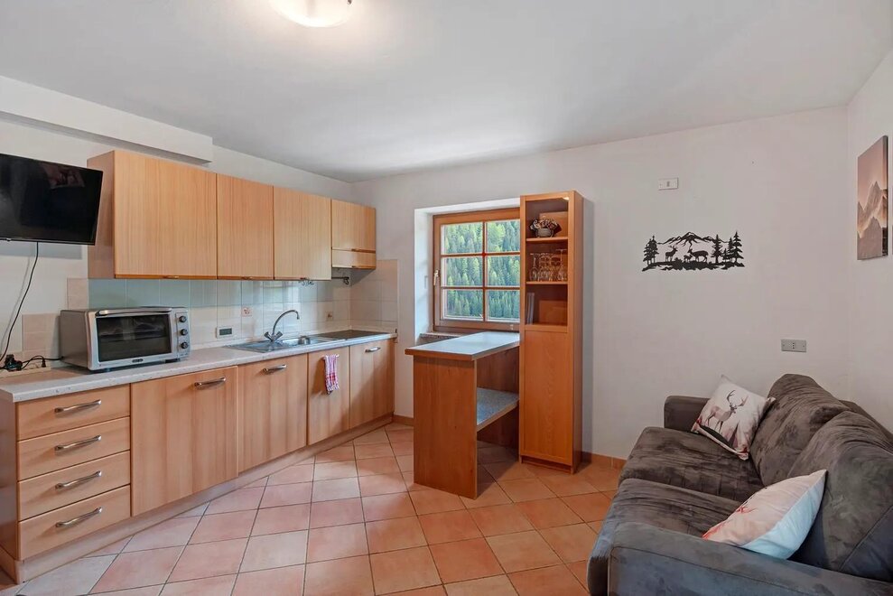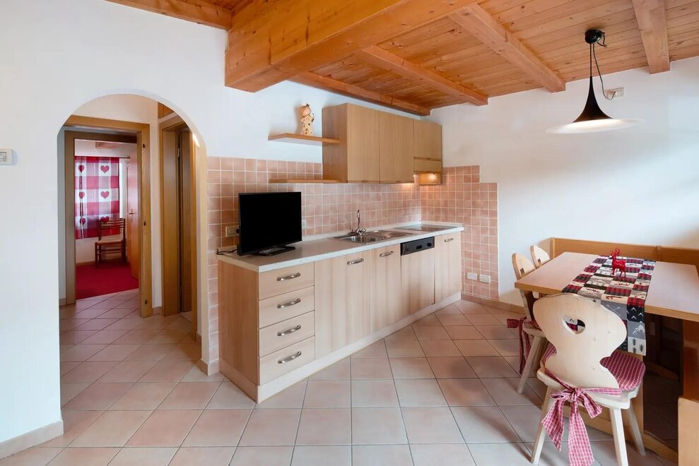 Zweizimmerwohnung in Alba di Canazei im ersten Stock mit Wohnküche, Doppelzimmer und Badezimmer. Zwei Balkone bieten einen herrlichen Blick auf unsere Berge.