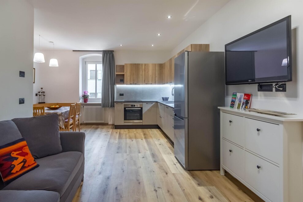 WiFi, Heizung, Haarföhn, Fernseher, Moderne Möblierung, Küchengeräte, Bügeleisen, Geschirr vorhanden, Wohnung ohne Teppichboden, Holz- oder Parkettboden, Geschirrspülmaschine, Decken, Kühlschrank, Backofen, Tisch- und Küchenwäsche, Geschirrspülbecken, Geschirr und Besteck, Schrank, Wohnküche, Mikrowelle, Deckbetten, Wohnzimmer
