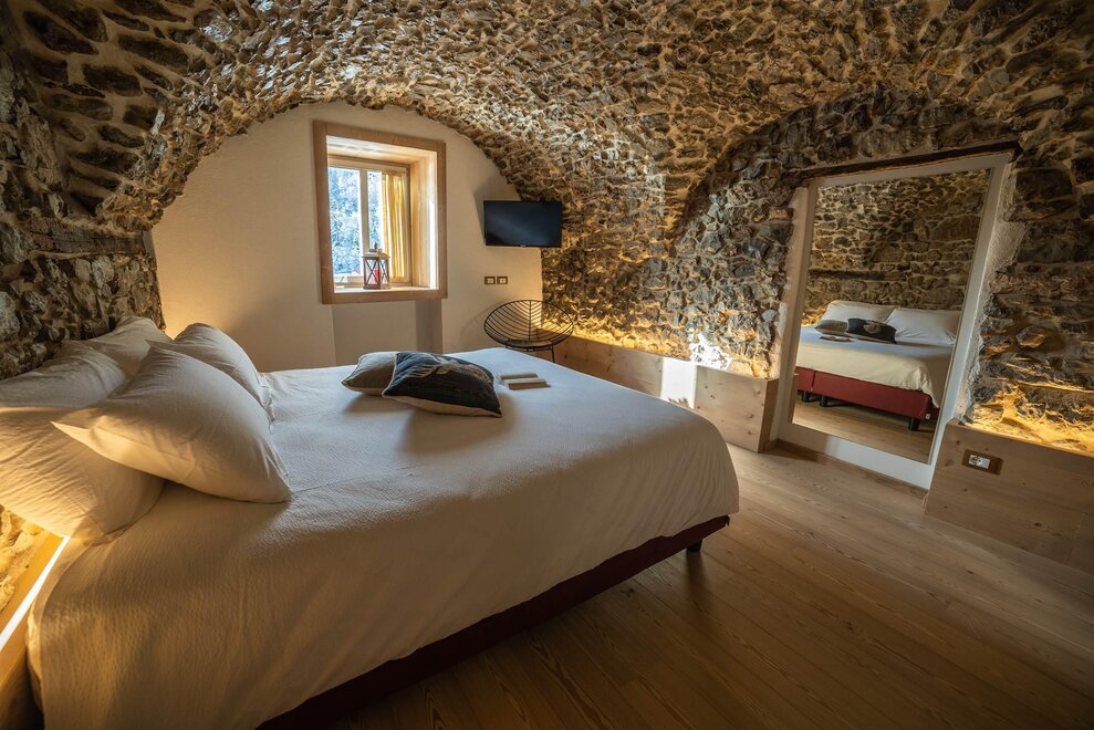 Ein Sprung in die Vergangenheit, aber mit dem Geschmack der Gegenwart. Das Holz, der Stein aus dem 19. Jahrhundert und das Heu koexistieren und formen eine elegante Umgebung mit dem romantischen Charme vergangener Zeiten, entspannend und mit allem modernen Komfort ausgestattet. Jede Suite mit Seeblick ist von den typischen Zimmern des Bauernhauses von einst inspiriert, wie "el Volt", "el Fenil", "la Stua" und "la Teza".