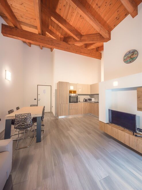 Ferienwohnung am 1. Stock von 50 mq mit Wohnzimmer mit kleiner Küche, Mikrowelle, Dusche, Föhn, Heizung, Balkon, reservierte Parkplatz im Freien, Garage, Keller, Aufzug, Bügel und Bügelbrett, Staubsauger, Fernsehsatellit, Tischwäsche, Bettwäsche und Badwäsche (auf Anfrage), kleine Tiere erlaubt.