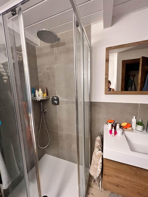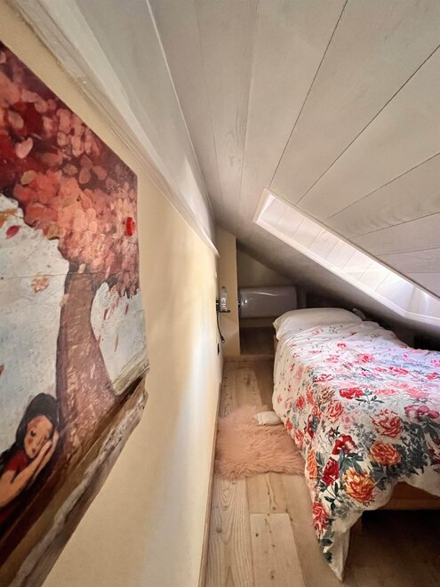 Es handelt sich um eine kleine, neu renovierte 4-Zimmer-Dachgeschosswohnung in einem Wohnkomplex, der aus drei identischen Gebäuden besteht (unseres ist das zentrale). Die Wohnung besteht aus einem Schlafzimmer mit Doppelbett, einem kleinen Einzelzimmer im Zwischengeschoss, einem Badezimmer und zwei überdachten Terrassen. Außerdem gibt es ein Doppelschlafsofa. Überdachte Garage und Parkplatz vorhanden.