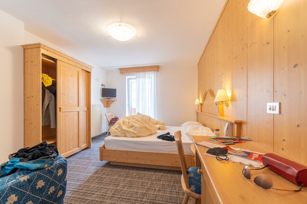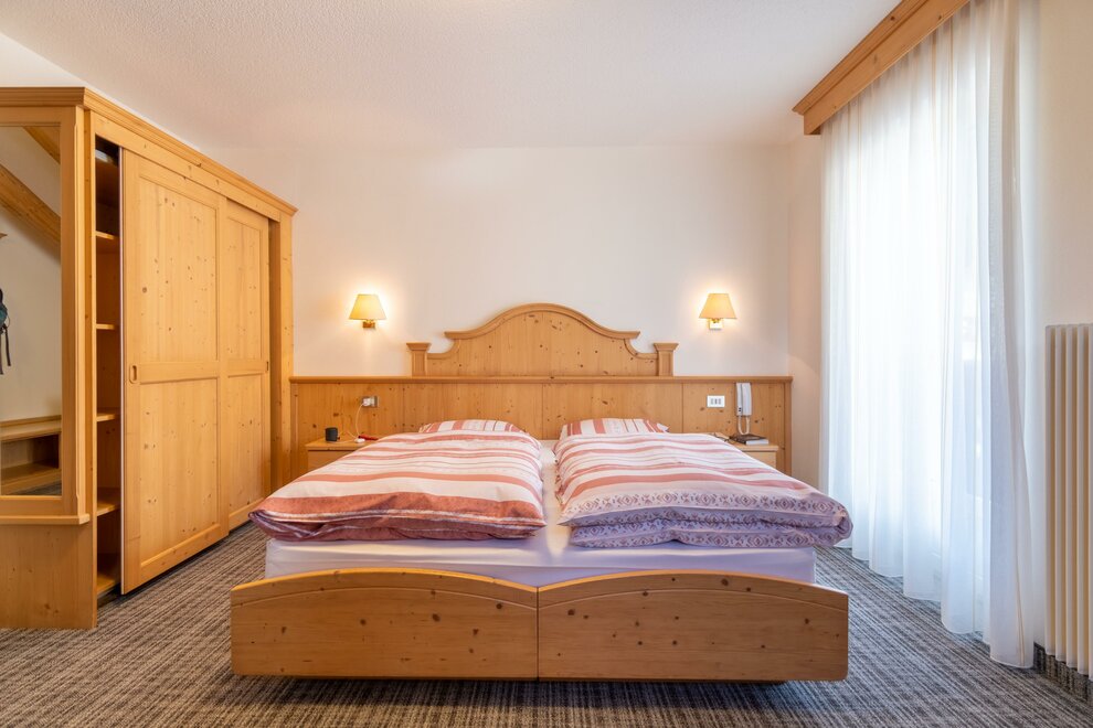 Die Zimmer sind schlicht und hell, alle auf die berühmte Märchenlandschaft von Canazei gerichtet.
