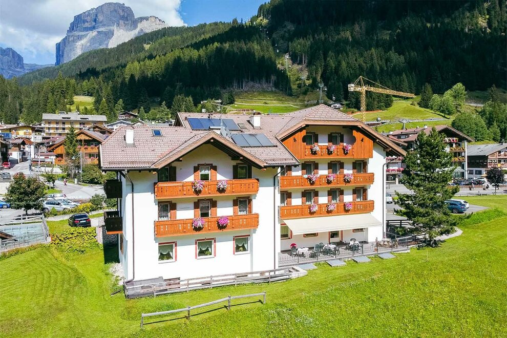 Wenn Sie etwas tiefer hinschauen, können Sie die Skischule in Canazei mit ihrem Kinderpark für Kinder nebenan und dem Schulplatz für das Skifahren leicht erkennen. Von unserem Hotel, dem Eghes Wasserzentrum Dolaondes und dem Spielplatz im Dorf sind Sie in weniger als fünf Minuten wieder in der Strasse.